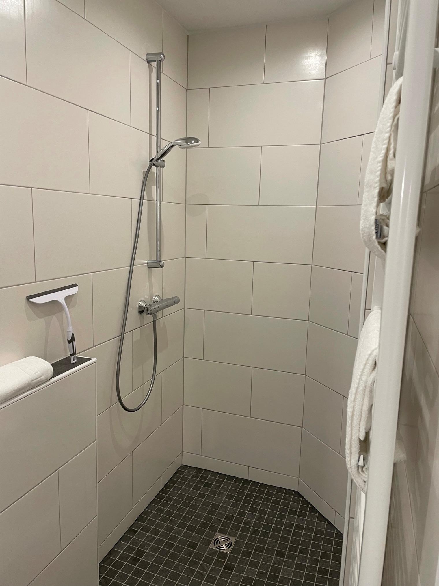 Das moderne Bad hat eine bodenebene Dusche, LED Beleuchtung, eine Waschtischkombination und einen Föhn.