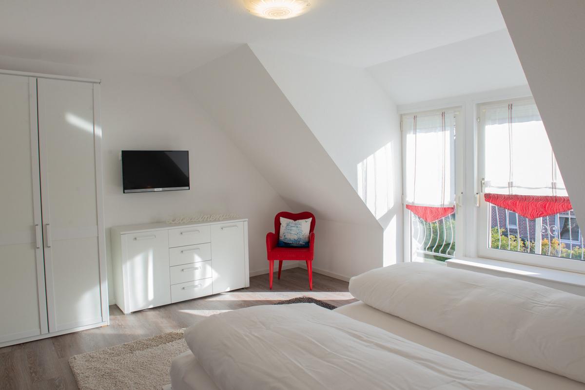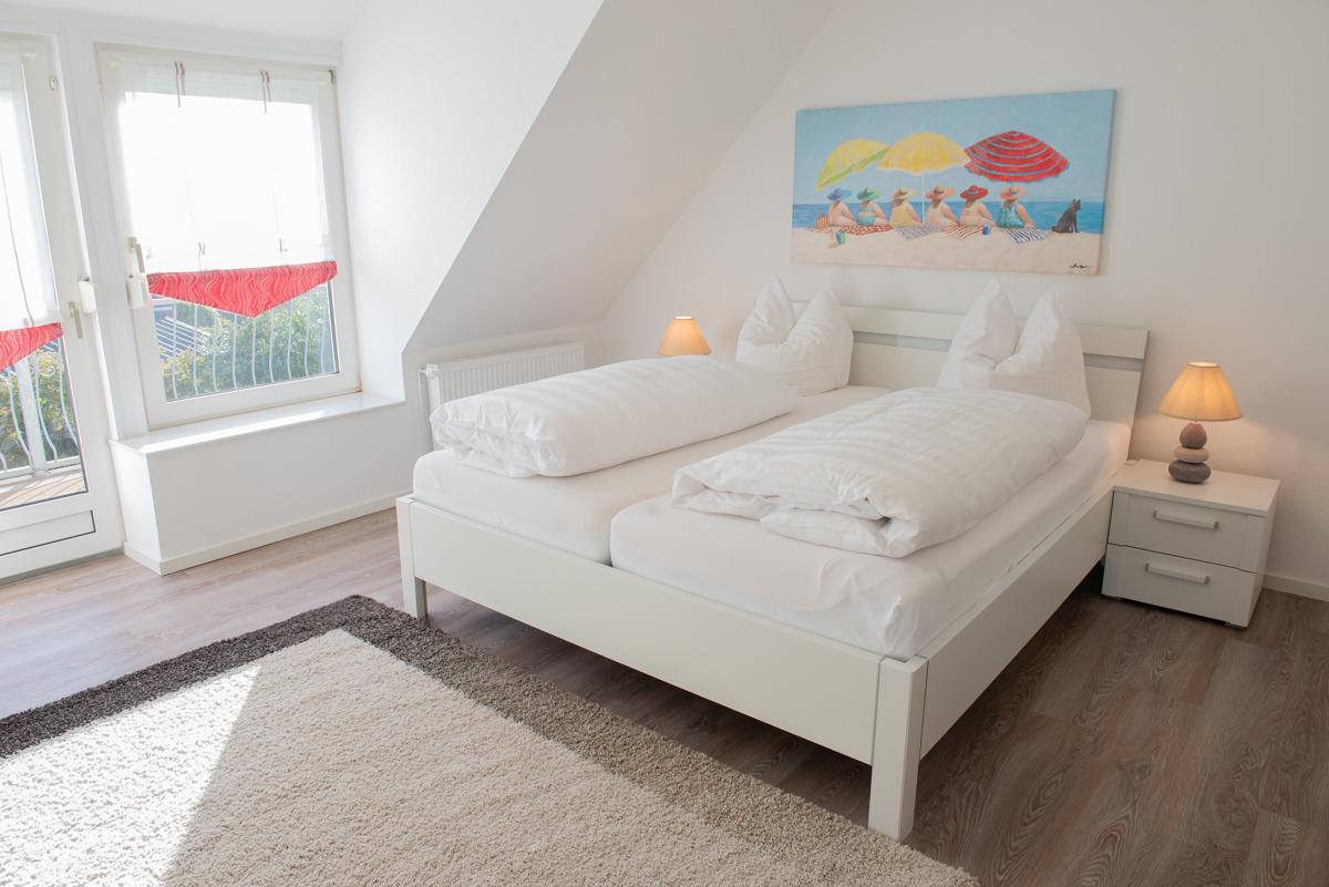 Die Ferienwohnung Achtersteven verfügt über zwei getrennte Schlafzimmer im 1. OG, davon ist ein Schlafzimmer mit Außenrolläden und SAT-TV ausgestattet. Außerdem befindet sich im 1. OG ein zusätzliches WC. Das moderne Bad / WC ist mit Fenster, einer bodenebenen Dusche und einem Handtuchhalter - Heizkörper ausgestattet.