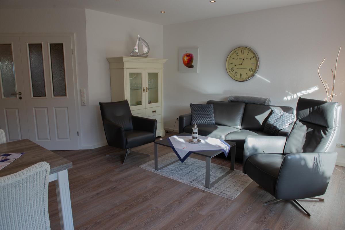 Im Wohn - Essbereich mit Tisch und 4 Stühlen sowie einer gemütlichen Couch, einem Sessel / Relax-Sessel und Sat-TV mit Flachbildschirm können Sie entspannt relaxen, essen oder z.B. mit der Familie oder Freunden einen Spieleabend gestalten. Die getrennte, compl. Eingerichtete Küche liegt ebenfalls im unteren Teil der Wohnung.