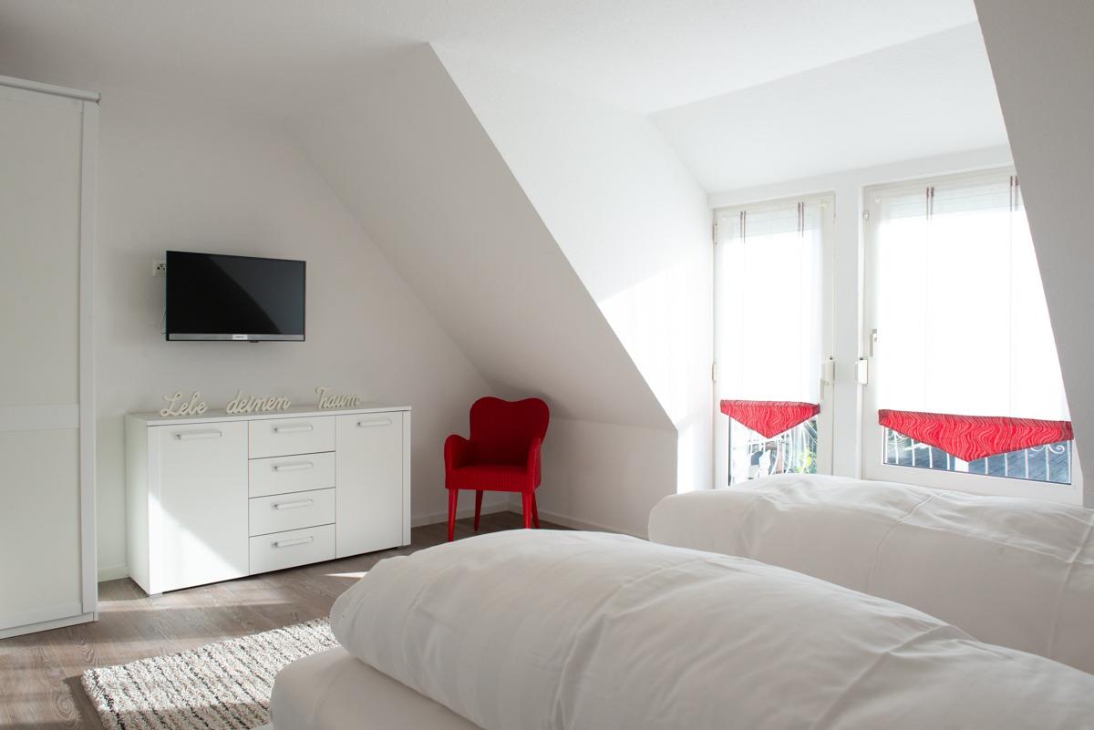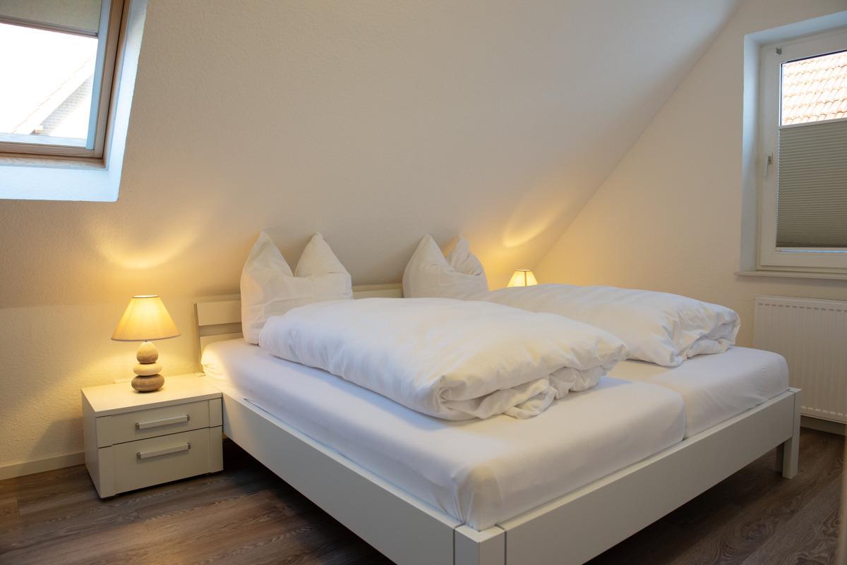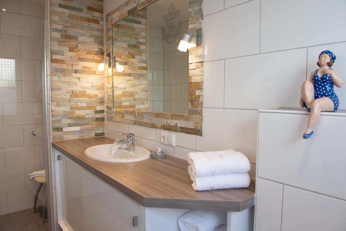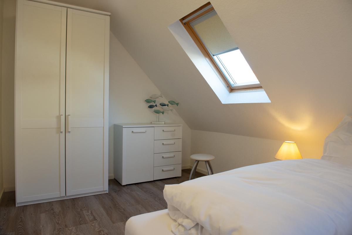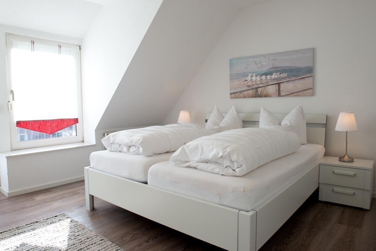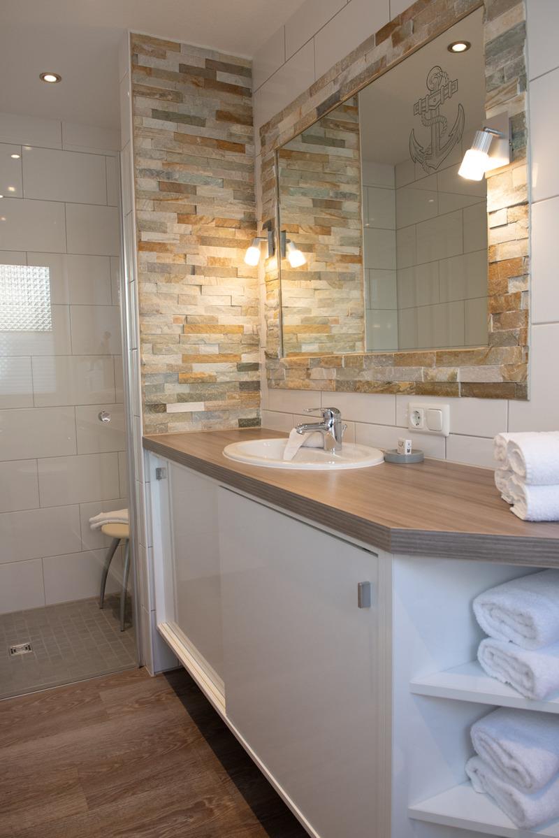 Die Ferienwohnung Backbord verfügt über zwei getrennte Schlafzimmer im 1. OG, davon ist ein Schlafzimmer mit Außenrollläden und SAT-TV ausgestattet. Außerdem befindet sich im 1. OG ein zusätzliches WC. Das moderne Bad / WC ist mit Fenster, einer bodenebenen Dusche und einem Handtuchhalter - Heizkörper ausgestattet.