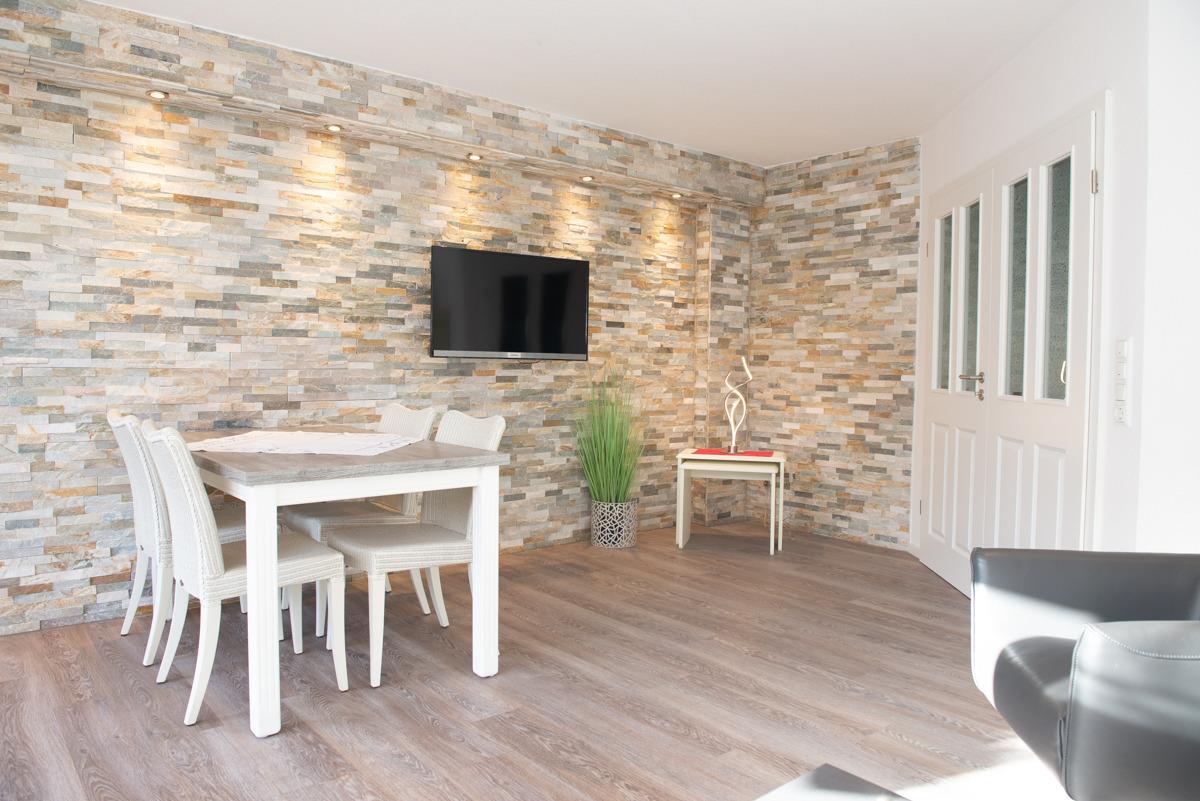Im Wohn - Essbereich mit Tisch und 4 Stühlen sowie einer gemütlichen Couch, einem Sessel / Relax-Sessel und Sat-TV mit Flachbildschirm können Sie entspannt relaxen, essen oder z.B. mit der Familie oder Freunden einen Spieleabend gestalten. Die getrennte, compl. Eingerichtete Küche liegt ebenfalls im unteren Teil der Wohnung.