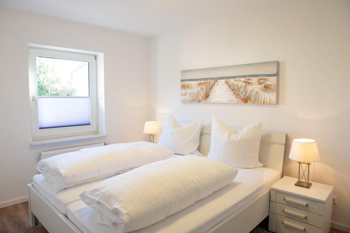 Die Ferienwohnung Deichnähe E liegt im 1.OG, verfügt über zwei getrennte Schlafzimmer, davon ist ein Schlafzimmer mit Doppelbett, Sat/TV, Außenrolladen und das zweite Schlafzimmer mit einem weiteren Doppelbett und Verdunklungs.-Plissees ausgestattet.
