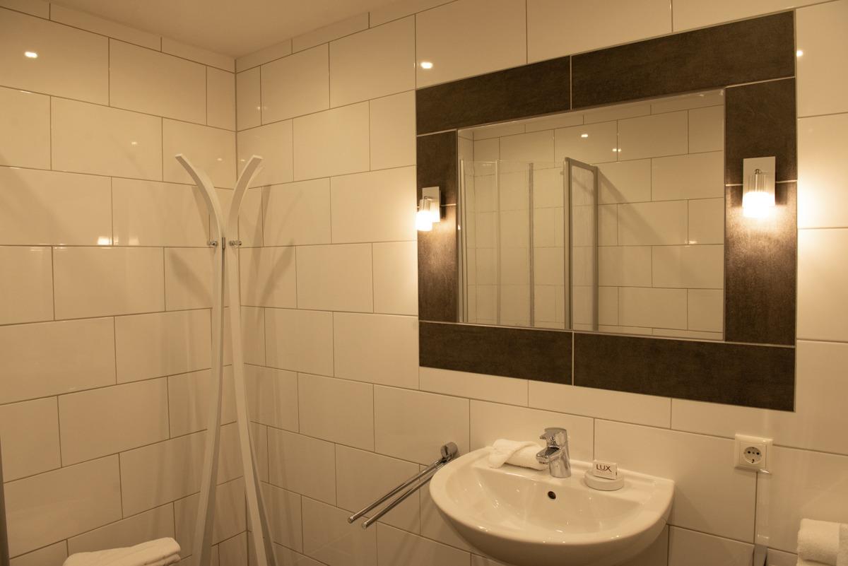 Das Bad mit Dusche u. WC ist hell und freundlich ausgestattet und verfügt über einen Hocker u. Föhn.