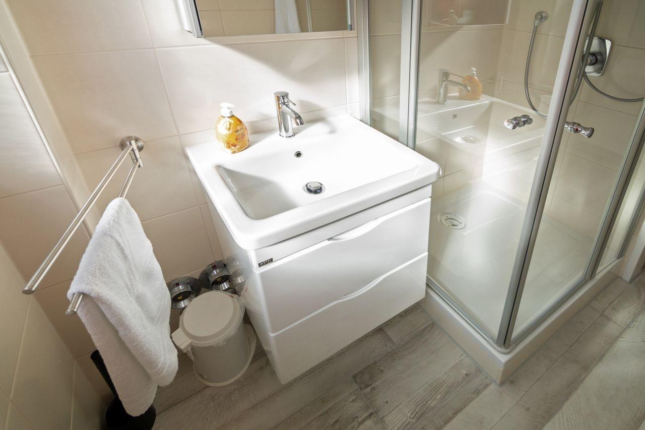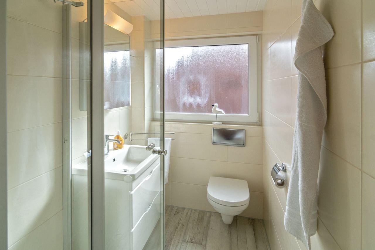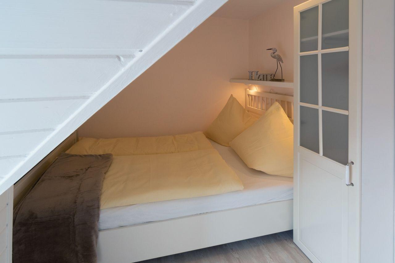 Zudem besitzt die Wohnung einen Schlafraum, der mit einem 140 x 200 cm großen Doppelbett mit durchgehender Matratze sowie einem weiteren kleinen Schrank ausgestattet ist. Weitere Garderobe und Utensilien sind im Wandschrank im Wohnbereich gut untergebracht. Im Badezimmer befinden sich eine komfortable Dusche, WC sowie eine Waschkombination mit Spiegel. Bei Bedarf können die Gäste die Waschmaschine im Gemeinschaftswaschraum des Hauses nutzen.