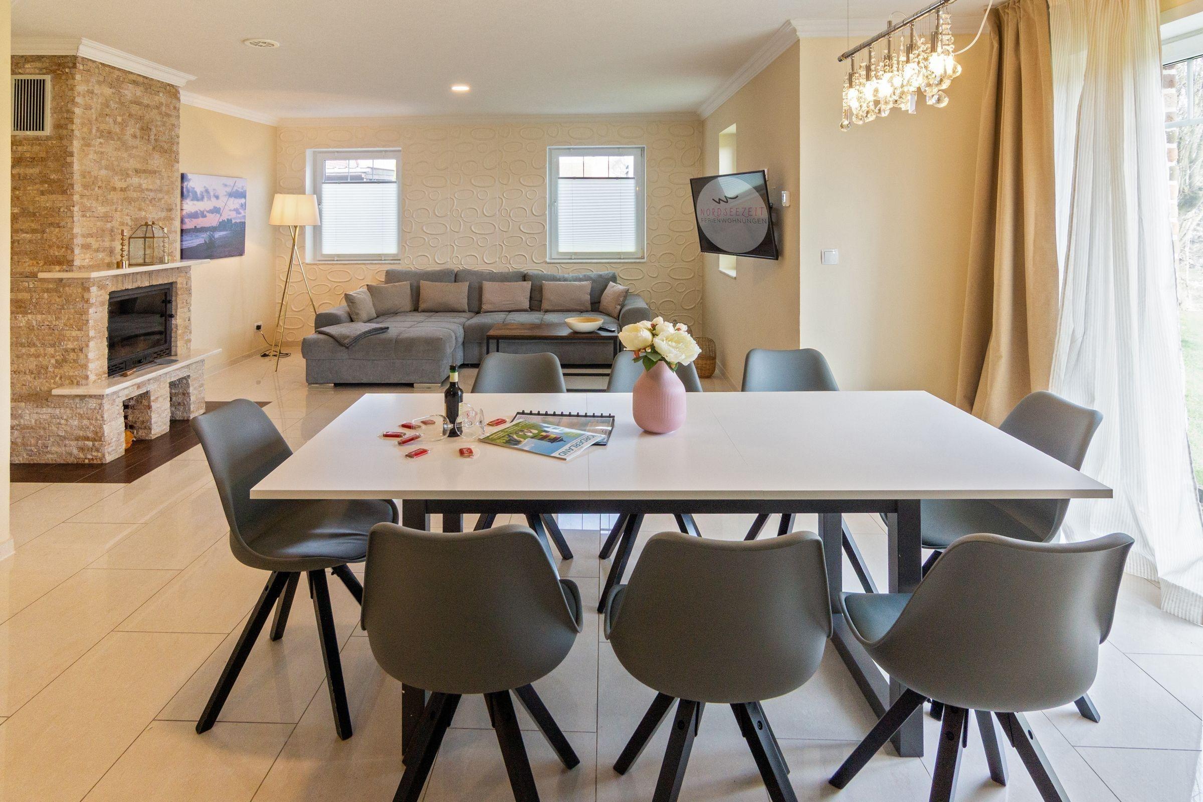 Diese moderne Ferienwohnung bietet großzügige 4 Schlafzimmer, ausgestattet mit 3 Doppelbetten und 2 Einzelbetten, ideal für Familien oder Gruppen. Die offene Küche ist mit einem Geschirrspüler, Elektro- und Gasherd, Backofen, Mikrowelle und Kühlschrank komplett ausgestattet und lässt keine Wünsche offen. Ein gemütlicher Esstisch eignet sich perfekt für gemeinsame Mahlzeiten. Die beiden hellen Badezimmer verfügen über eine Badewanne, Duschbad und Fußbodenheizung, während der Haartrockner und das Bidet zusätzlichen Komfort bieten. Ein Kamin sorgt für wohlige Wärme an kühlen Abenden. Die Wohnung ist allergikergeeignet und bietet WLAN, TV und eine HiFi-Anlage für Unterhaltung. Für zusätzliche Annehmlichkeiten stehen eine Waschmaschine, ein Bügeleisen und ein Staubsauger zur Verfügung. Ein Parkplatz und Fliegengitter sind ebenso vorhanden. Kinder können sich mit Brettspielen vergnügen oder draußen unter dem Sonnenschirm spielen. Ein idealer Rückzugsort für entspannte Urlaubstage.