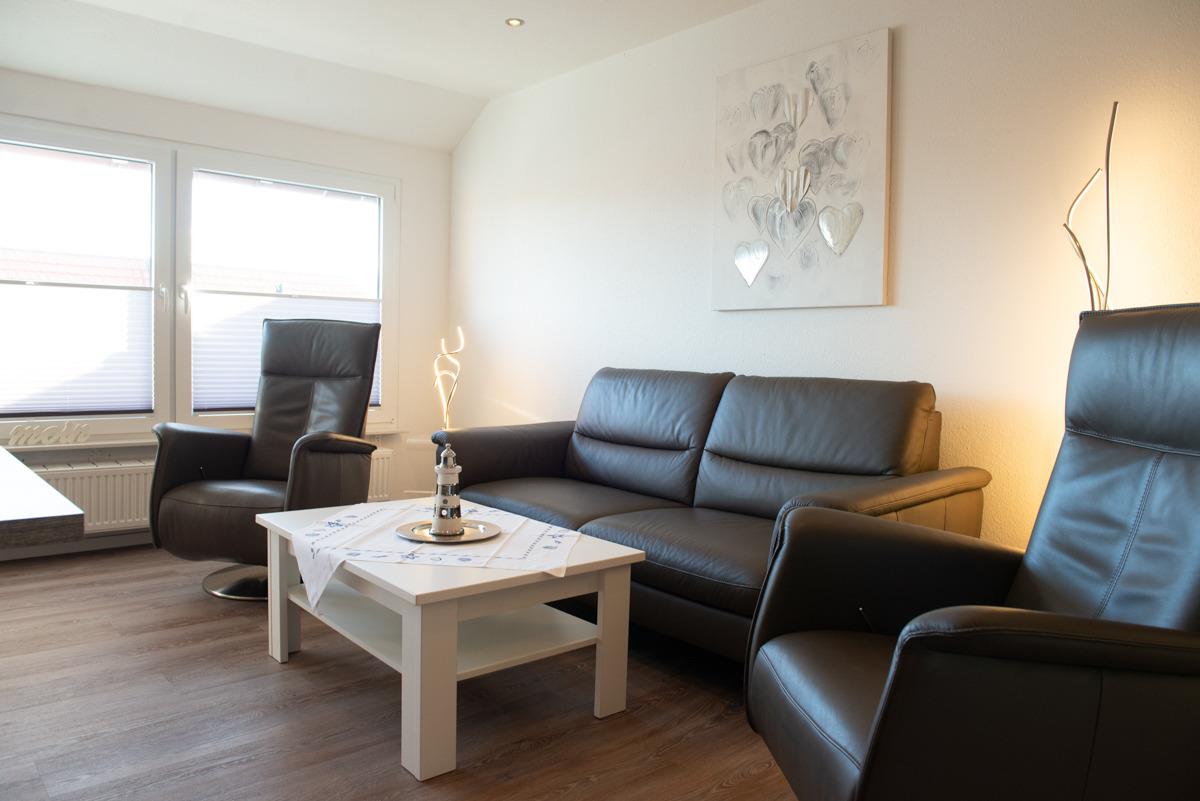 Im Wohn - Essbereich mit Tisch und 4 Stühlen sowie einer gemütlichen Couch, zwei Relax-Sessel und Sat/TV mit Flachbildschirm können Sie entspannt relaxen und der Balkon lädt zum Sonnenbaden ein. Die Küche ist getrennt vom Wohnbereich und hält alle Kochutensilien für Sie bereit.