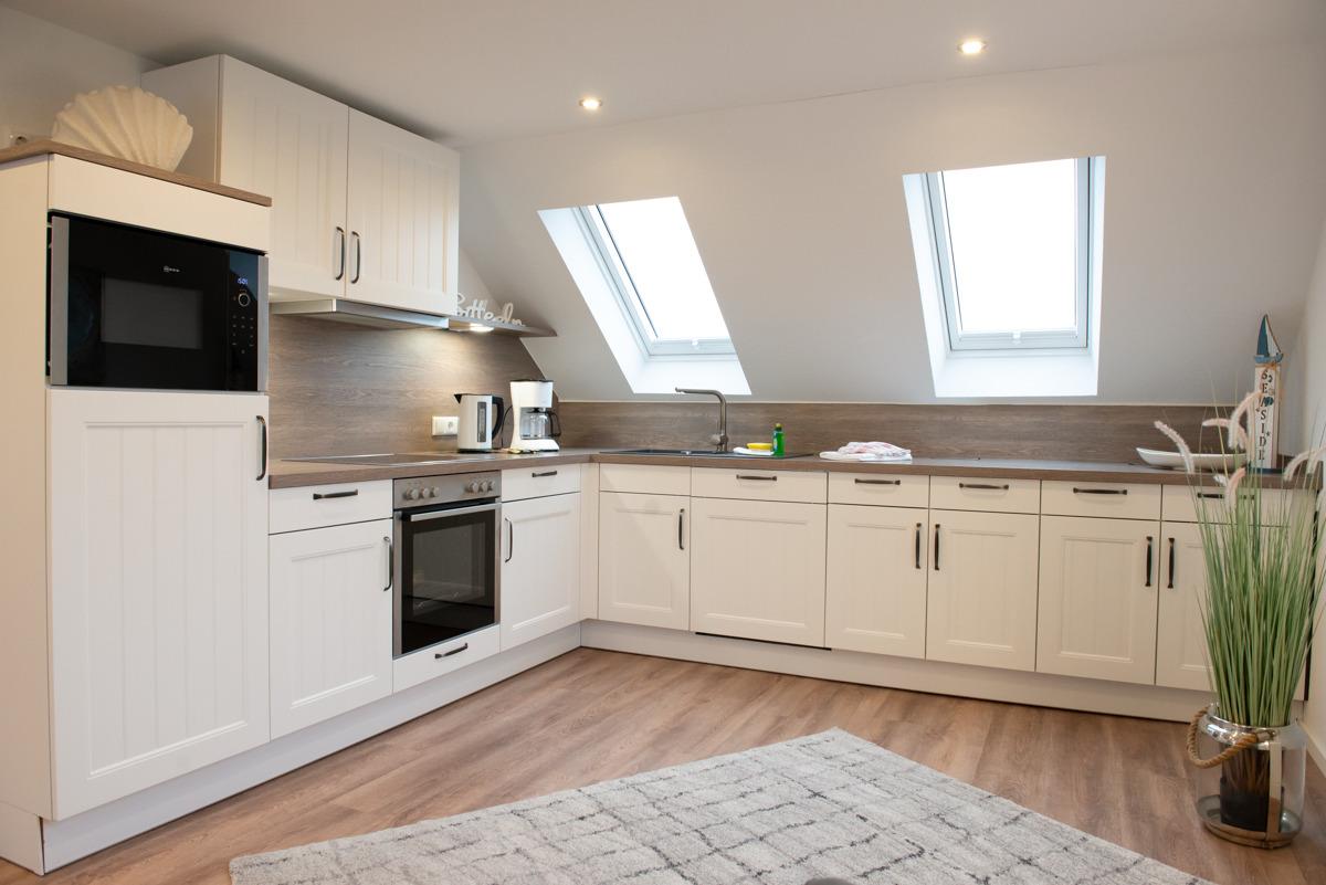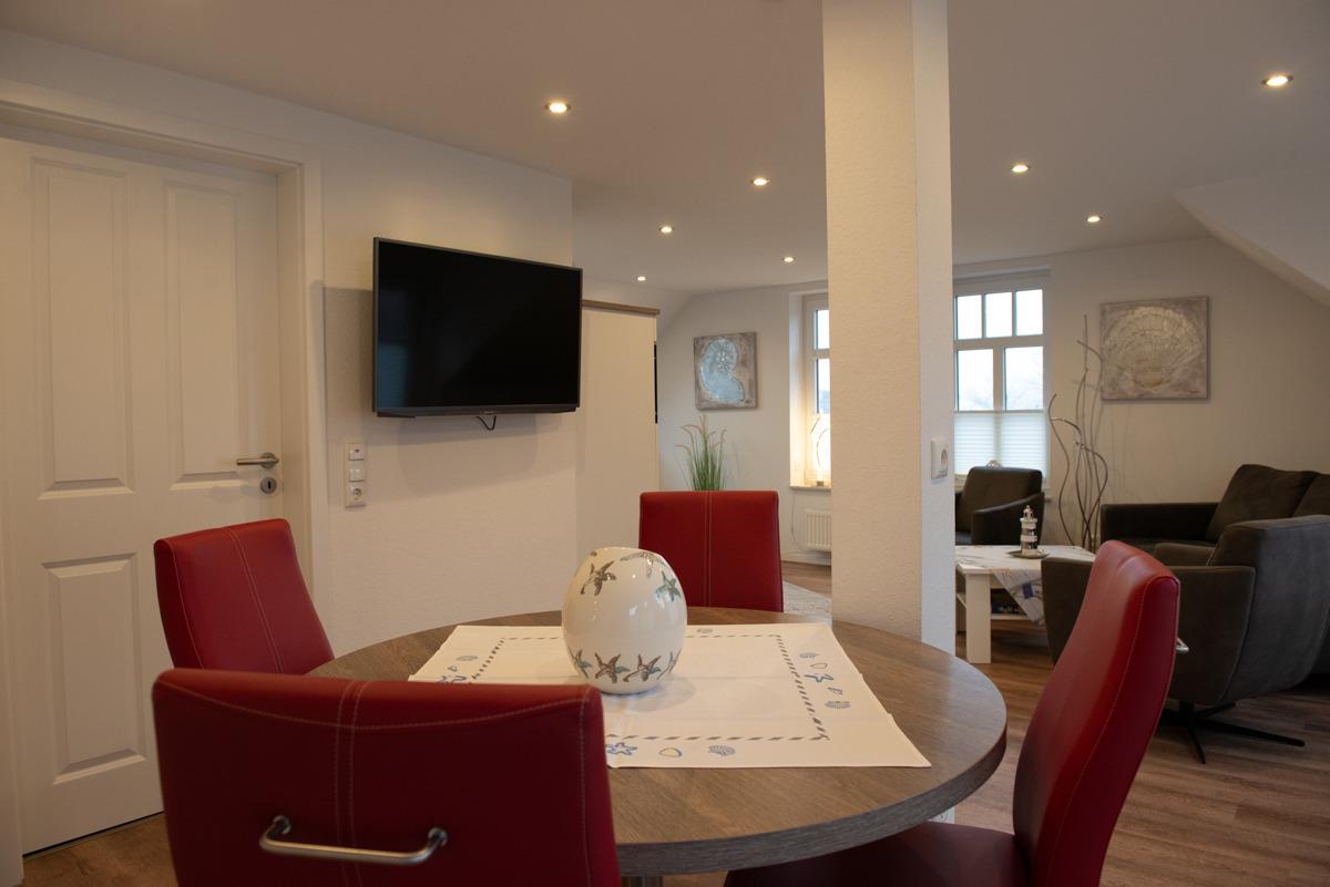 Das Wohn - und Esszimmer mit integrieter Einbauküche und Sat/TV Flachbildschirm ist sehr freundlich und hell eingerichtet. Die Einbauküche ist voll ausgestattet. Ein gemütliches Sofa mit 2 Sessel sowie ein runder Esstisch mit 4 Stühlen laden zum Relaxen ein.