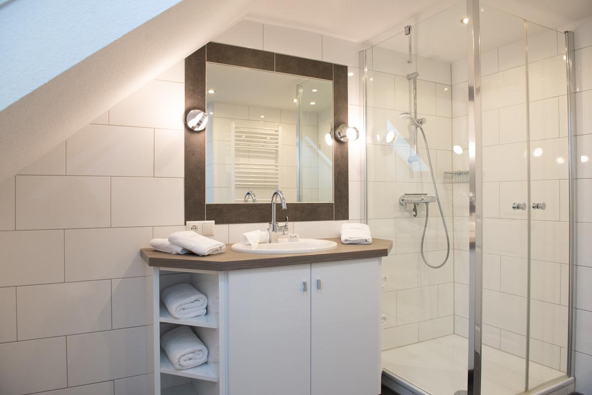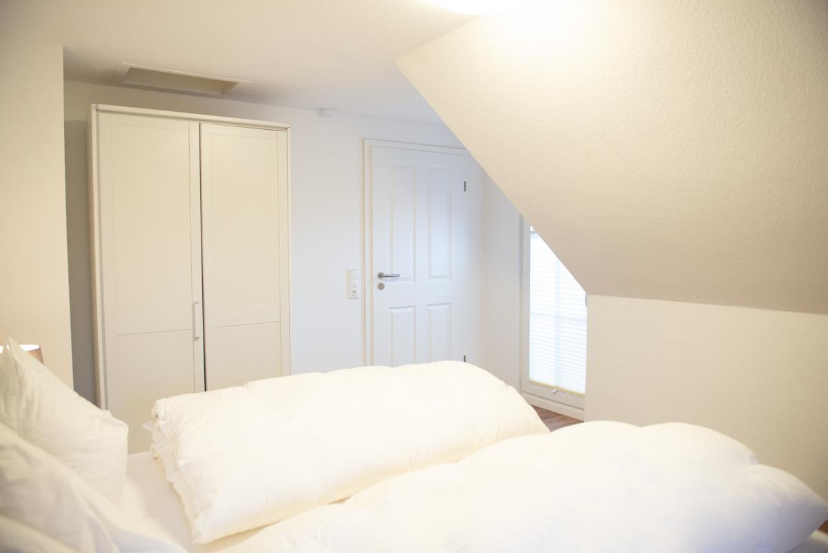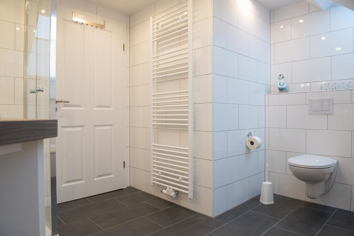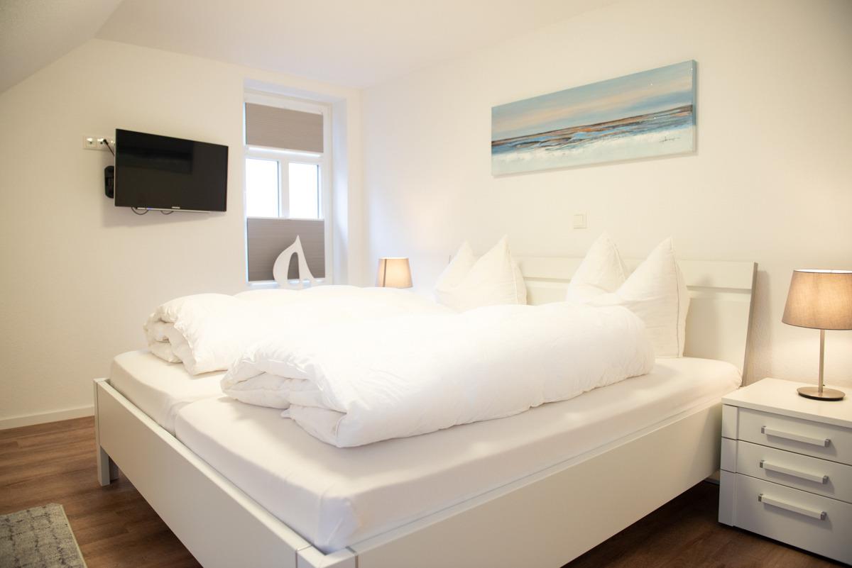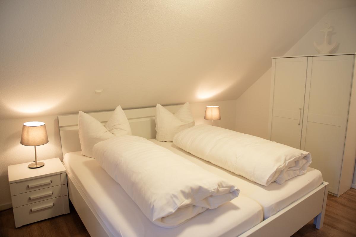 Die Ferienwohnung Stürhus liegt compl. auf der ersten Etage mit einem schönen Sonnenbalkon. Die Wohnung ist über eine Außentreppe erreichbar. Sie verfügt über zwei getrennte Schlafzimmer für 3 Personen mit Verdunklungsplissees und es ist bei beiden Schlafzimmern ein TV/Sat Flachbildschirm vorhanden. Das moderne Bad/WC ist mit zwei Veluxfenstern und einer Dusche, Handtuch-Heizungskörper ausgestattet.