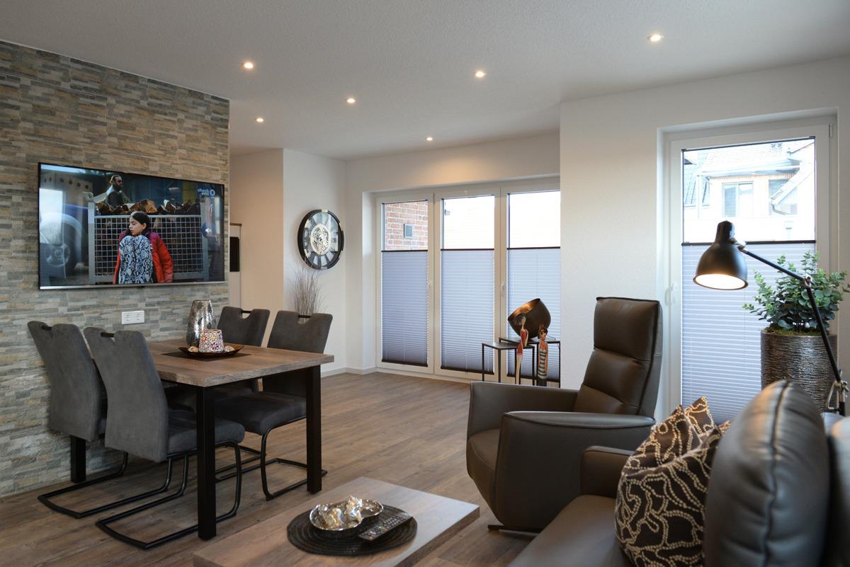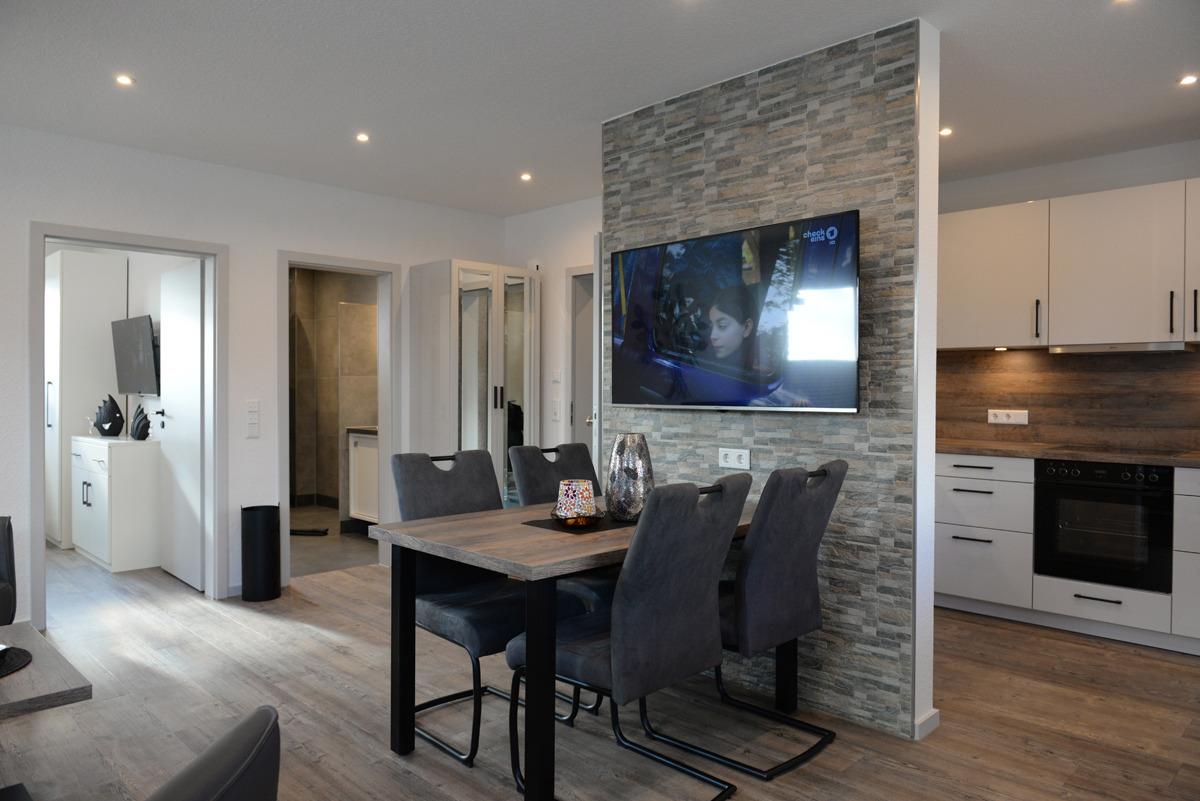 Das Wohn/Esszimmer ist mit einer gemütlichen Couch u. 2 Relaxsessel, einem Flachbildschirm-Fernseher, einer Essgruppe und einer voll ausgestatteten Einbauküche eingerichtet. Von dort aus gelangen Sie auf eine teilweise überdachte Terrasse, die mit Gartenmöbeln und Sonnenschirm ausgestattet ist. Dieses Plätzchen lädt sie zum Sonnenbaden oder für den späteren Sonnenuntergang am Abend ein.