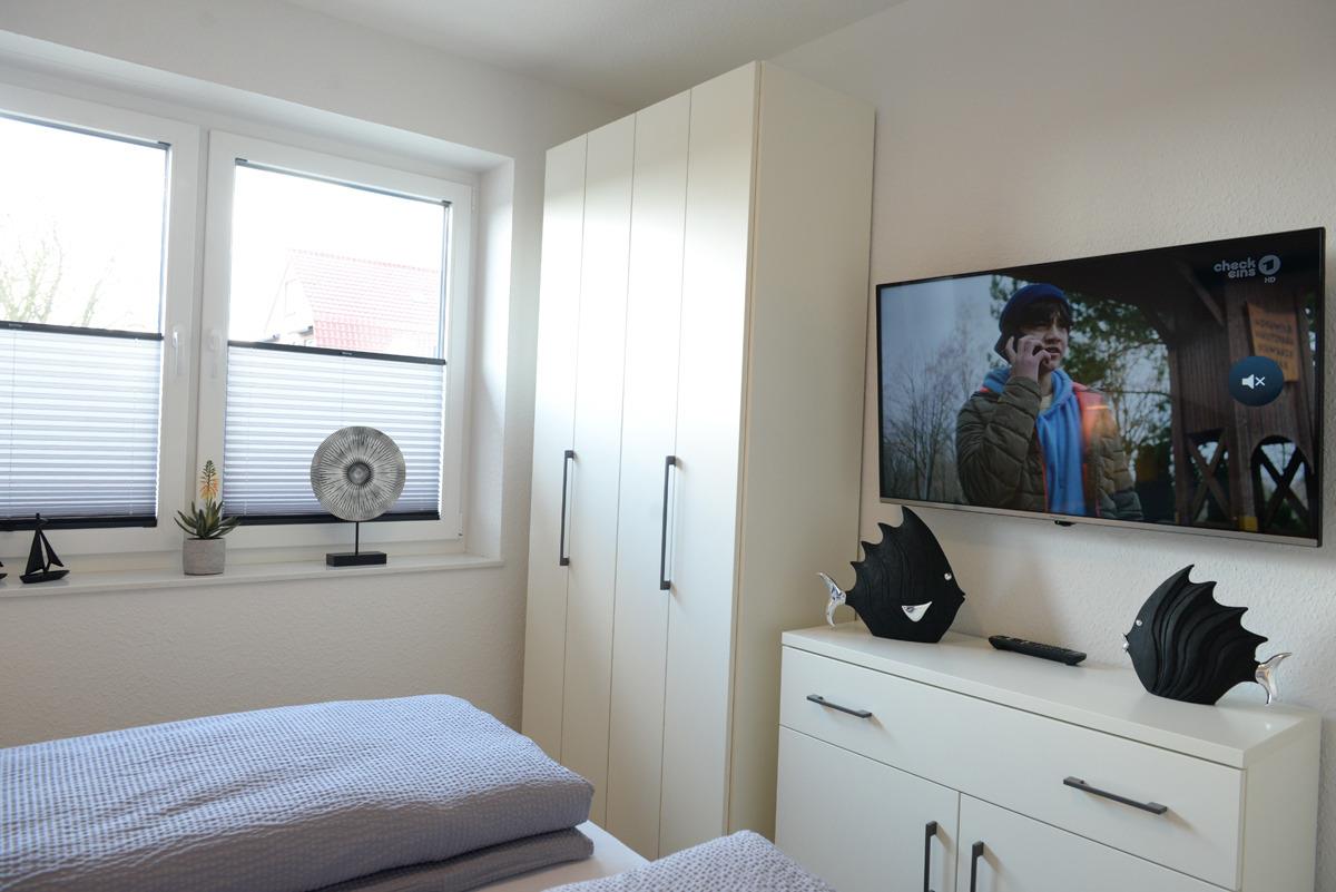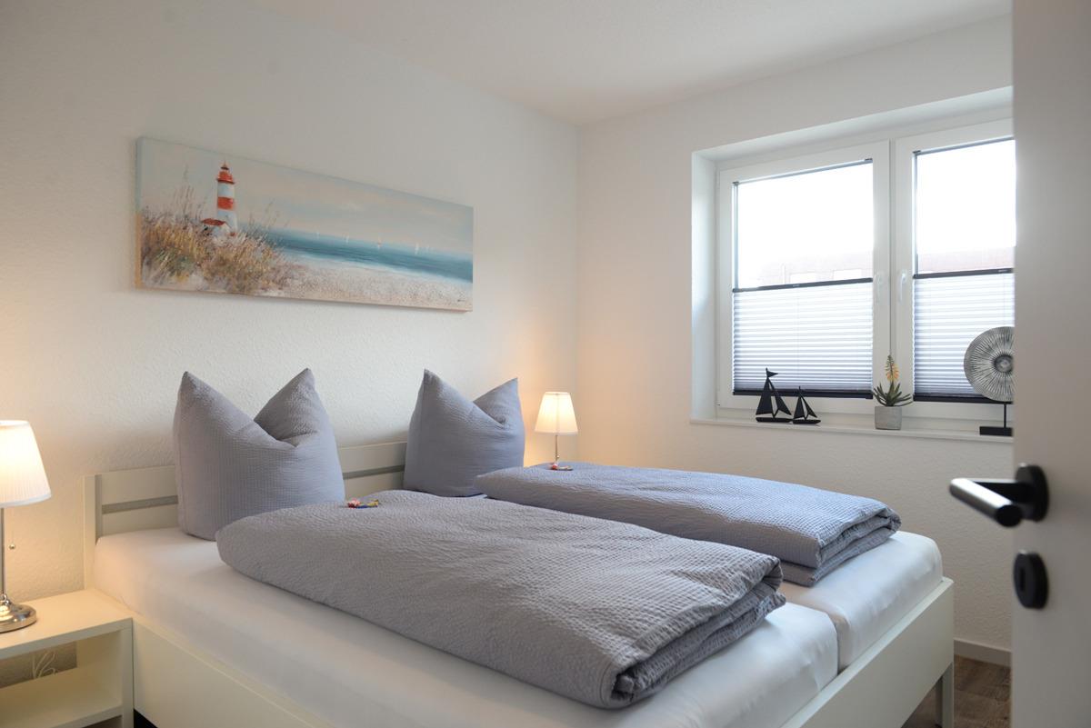 Das Schlafzimmer ist mit einem Doppelbett, Sat/TV, elektrische Außenrollläden + Verdunklungsplissees ausgestattet.