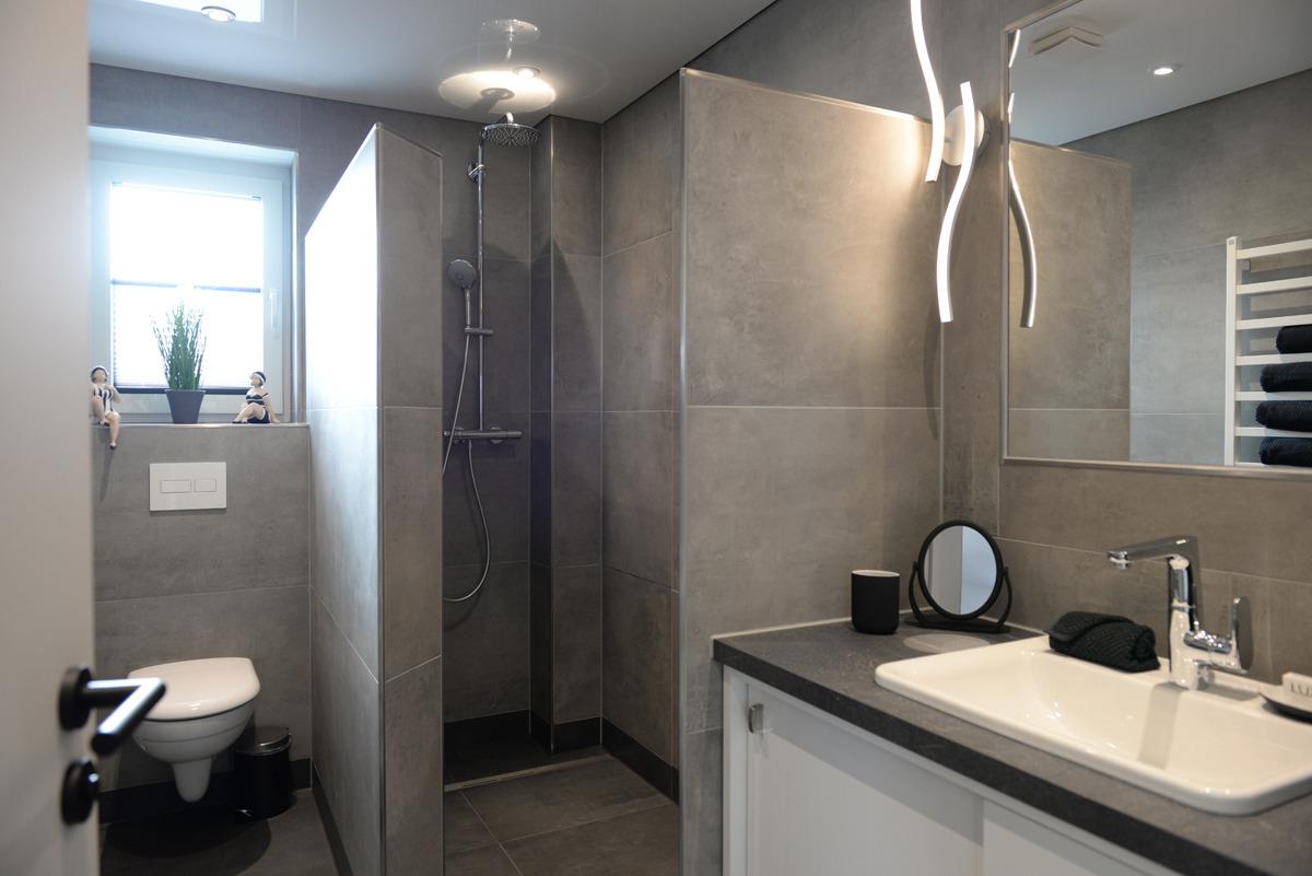 Das moderne Badezimmer mit Fenster verfügt über eine bodenebene Dusche, einen WC, eine Waschtischkombination mit großem Spiegel, Föhn usw.