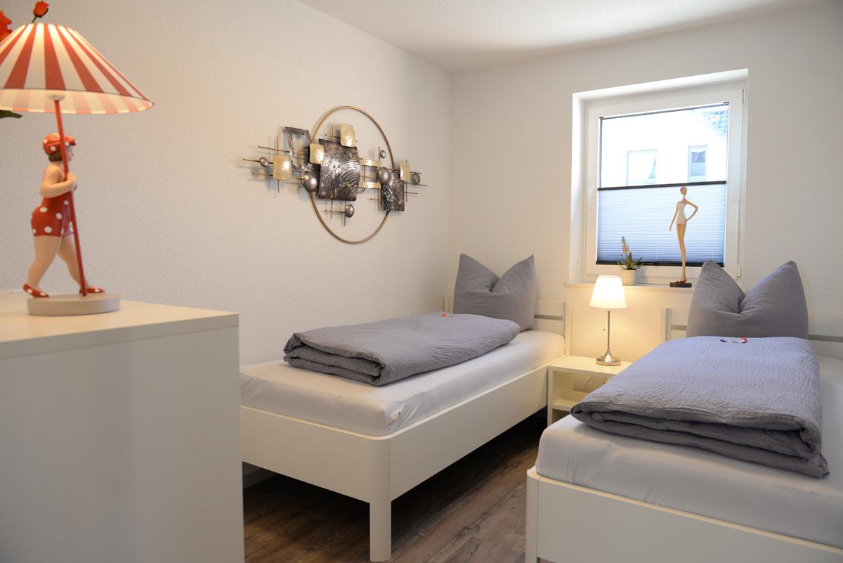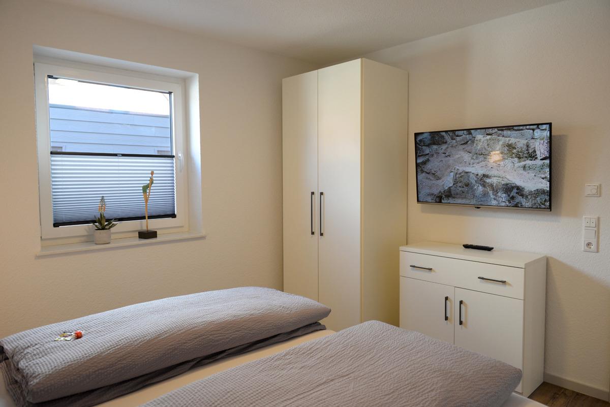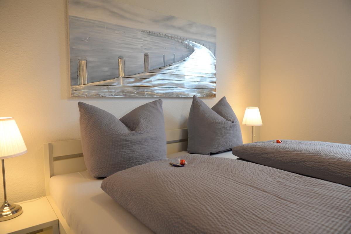 Die Wohnung verfügt über zwei getrennte Schlafzimmer, davon ist ein Schlafzimmer mit Doppelbett, SAT/TV und das weitere Schlafzimmer mit zwei Einzelbetten ausgestattet, zusätzlich besitzen beide Zimmer Fenster mit elektrischen Außenjalousien.