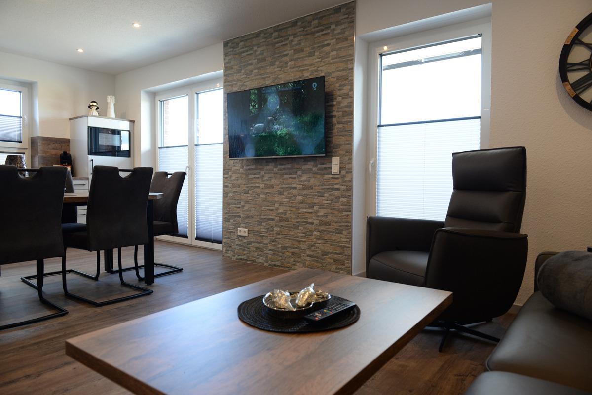 Das Wohn/Esszimmer ist mit einer gemütlichen Couch u. 2 Relaxsessel, einem Flachbildschirm-Fernseher, einer Essgruppe und einer voll ausgestatteten Einbauküche eingerichtet. Von dort aus gelangen Sie auf eine teilweise überdachte Terrasse, die mit Gartenmöbeln und Sonnenschirm ausgestattet ist. Dieses Plätzchen lädt sie zum Sonnenbaden oder für den späteren Sonnenuntergang am Abend ein.
