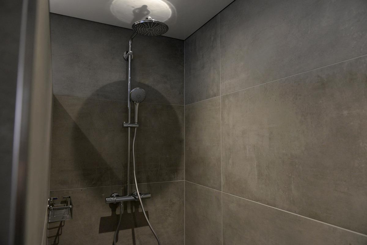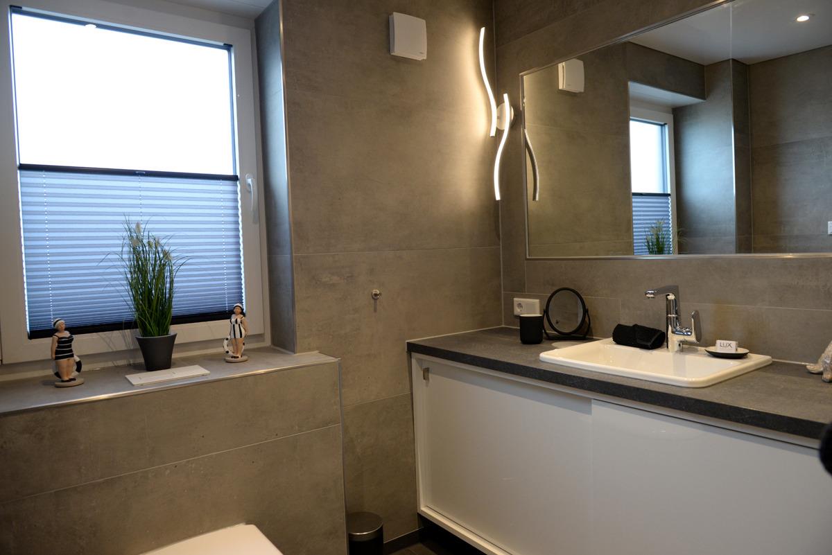 Das moderne Badezimmer mit Fenster verfügt über eine bodenebene Dusche, einem WC, eine Waschtischkombination mit großem Spiegel, Föhn usw.