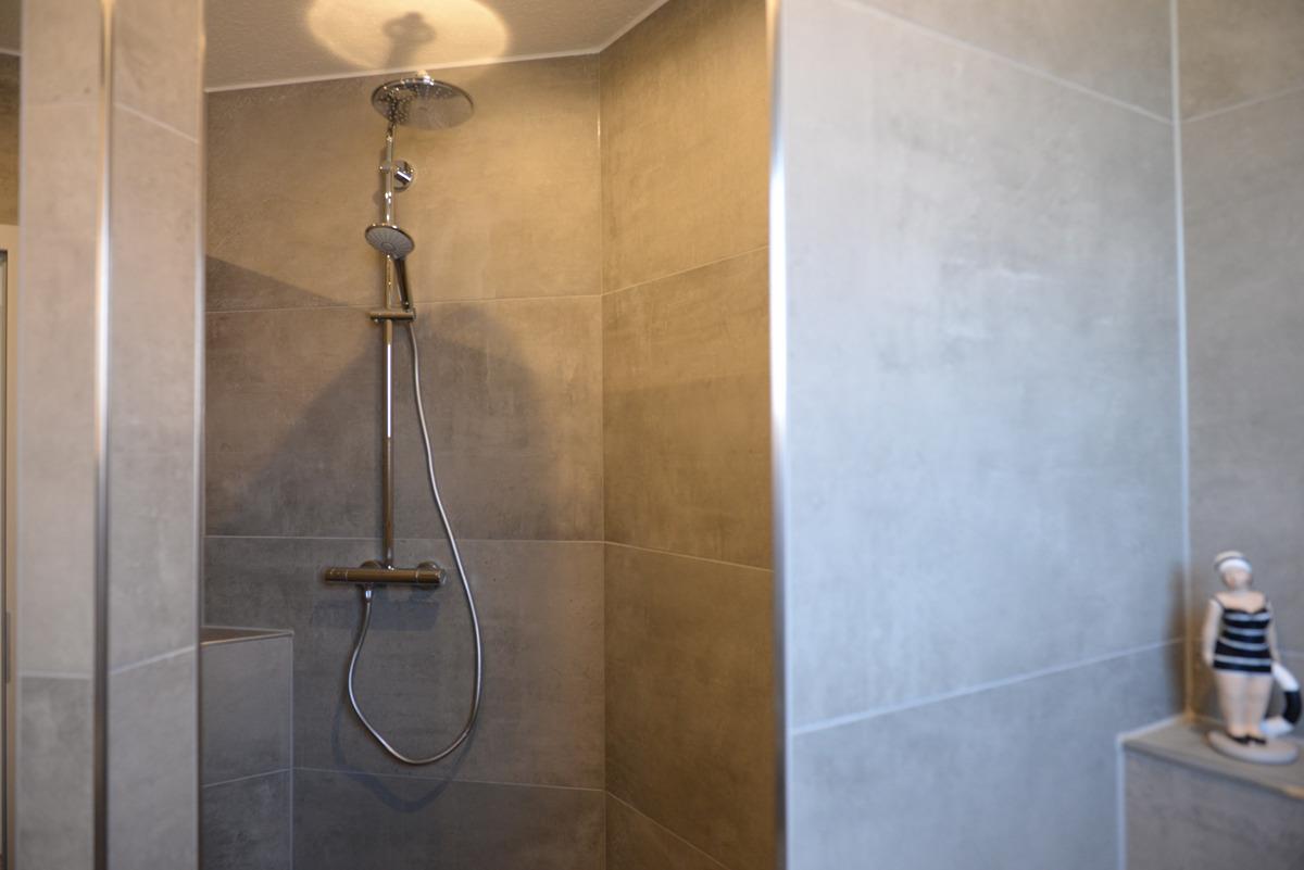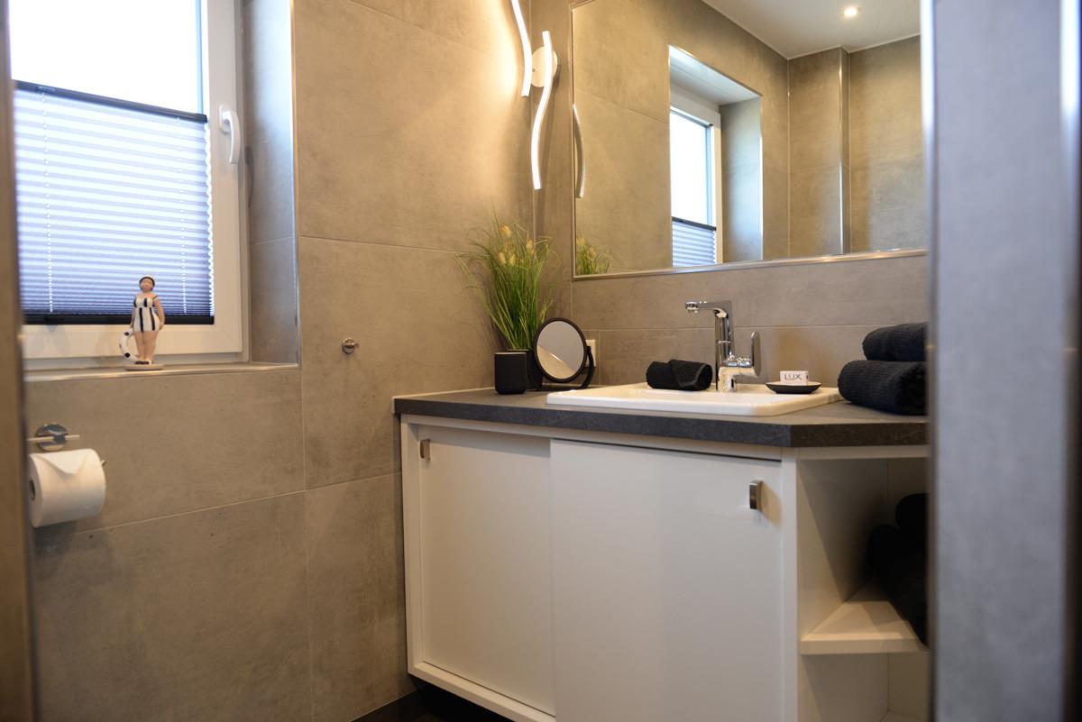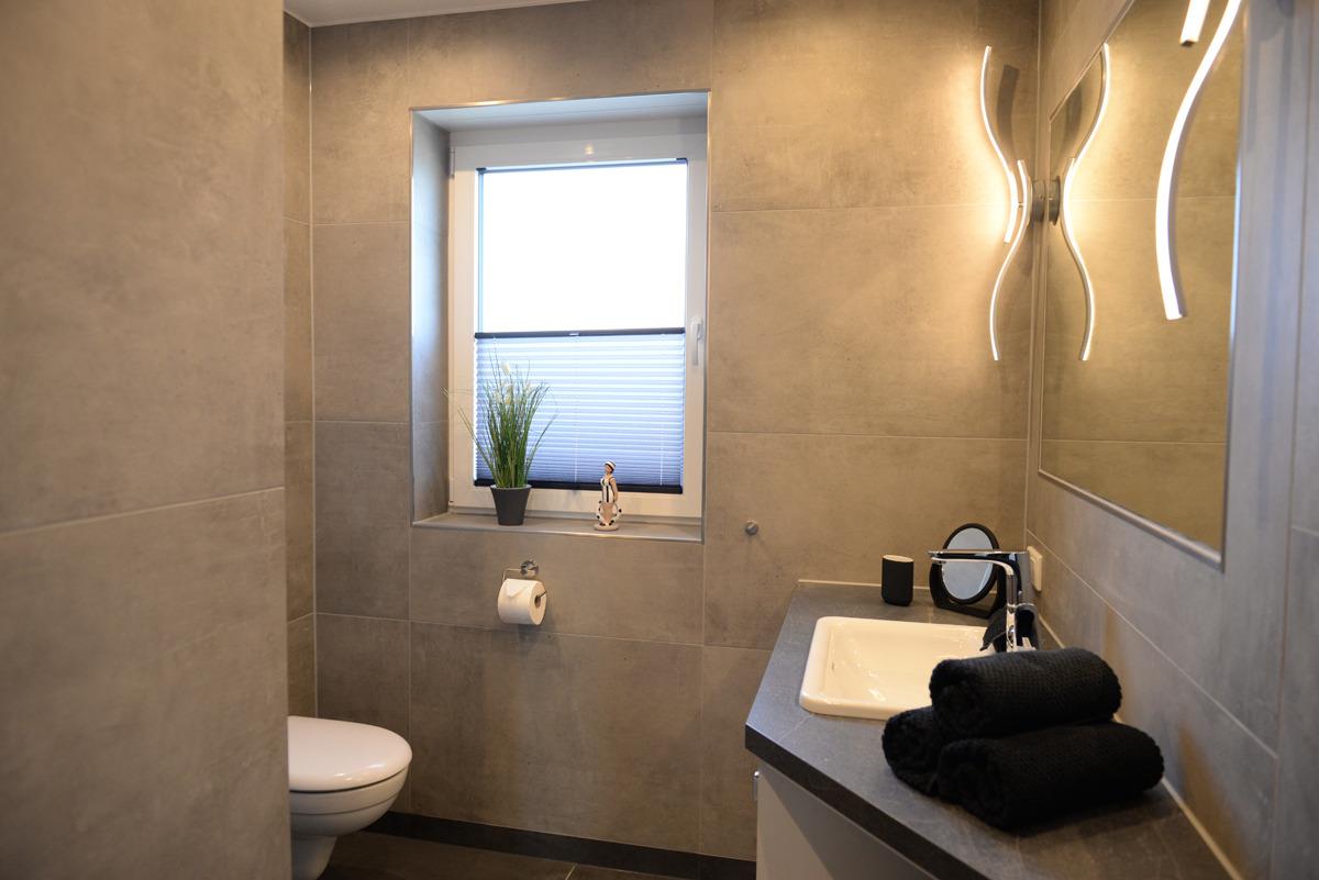 Das moderne Badezimmer mit Fenster verfügt über eine bodenebene Dusche, einem WC, eine Waschtischkombination mit großem Spiegel, Föhn usw.