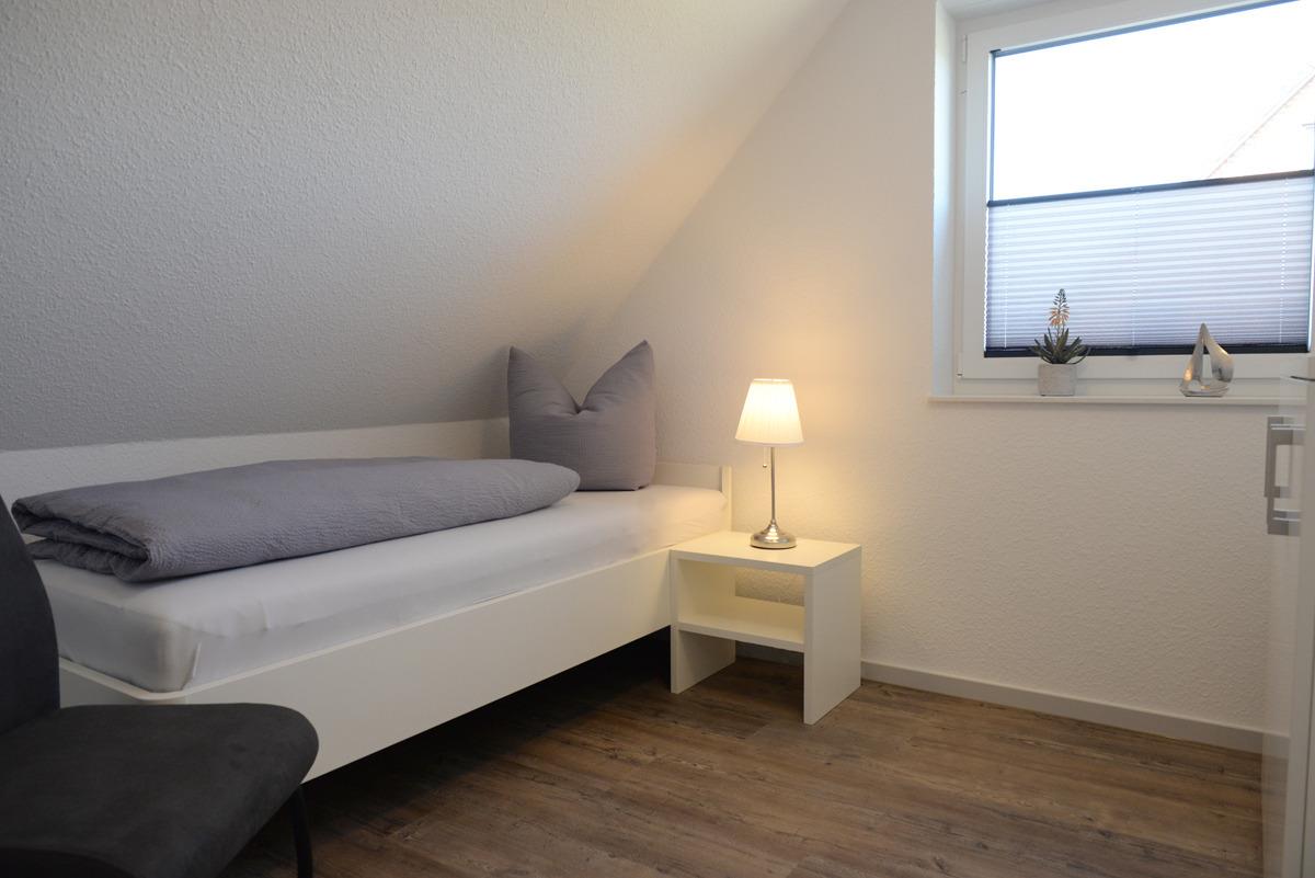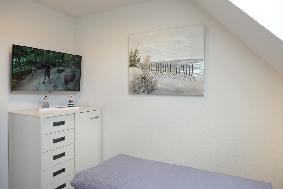 Die Wohnung verfügt über zwei getrennte Schlafzimmer, davon ist ein Schlafzimmer mit Doppelbett, SAT/TV, Veluxfenster mit elektrischer Verdunklung und das weitere Schlafzimmer mit einem Einzelbett und einem Fenster mit elektrischer Außenjalousie ausgestattet.