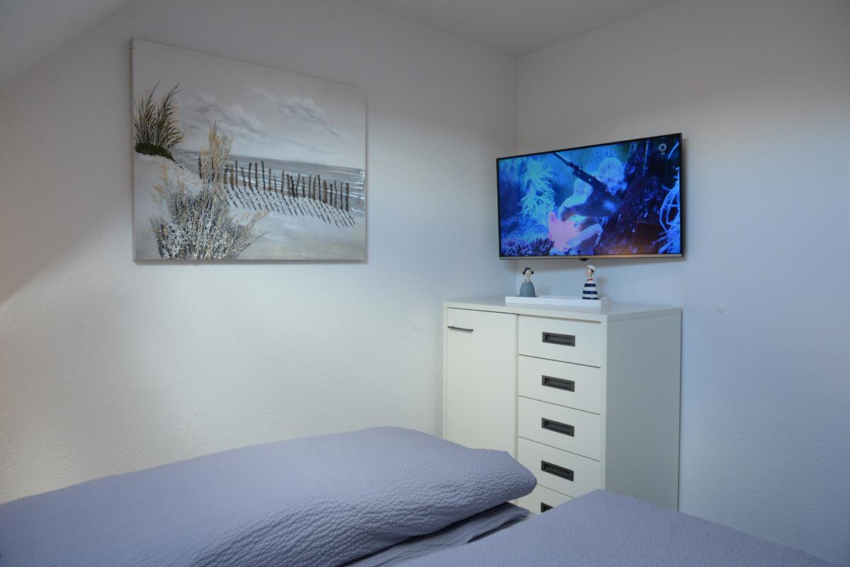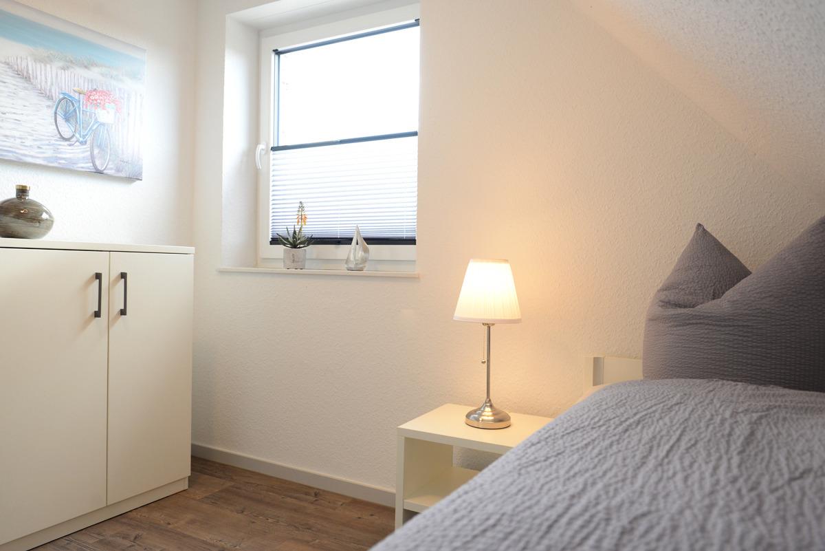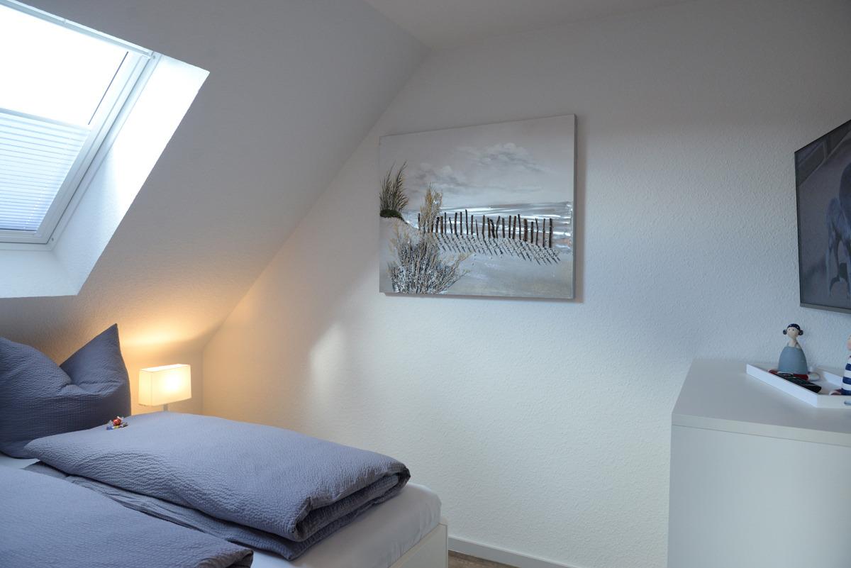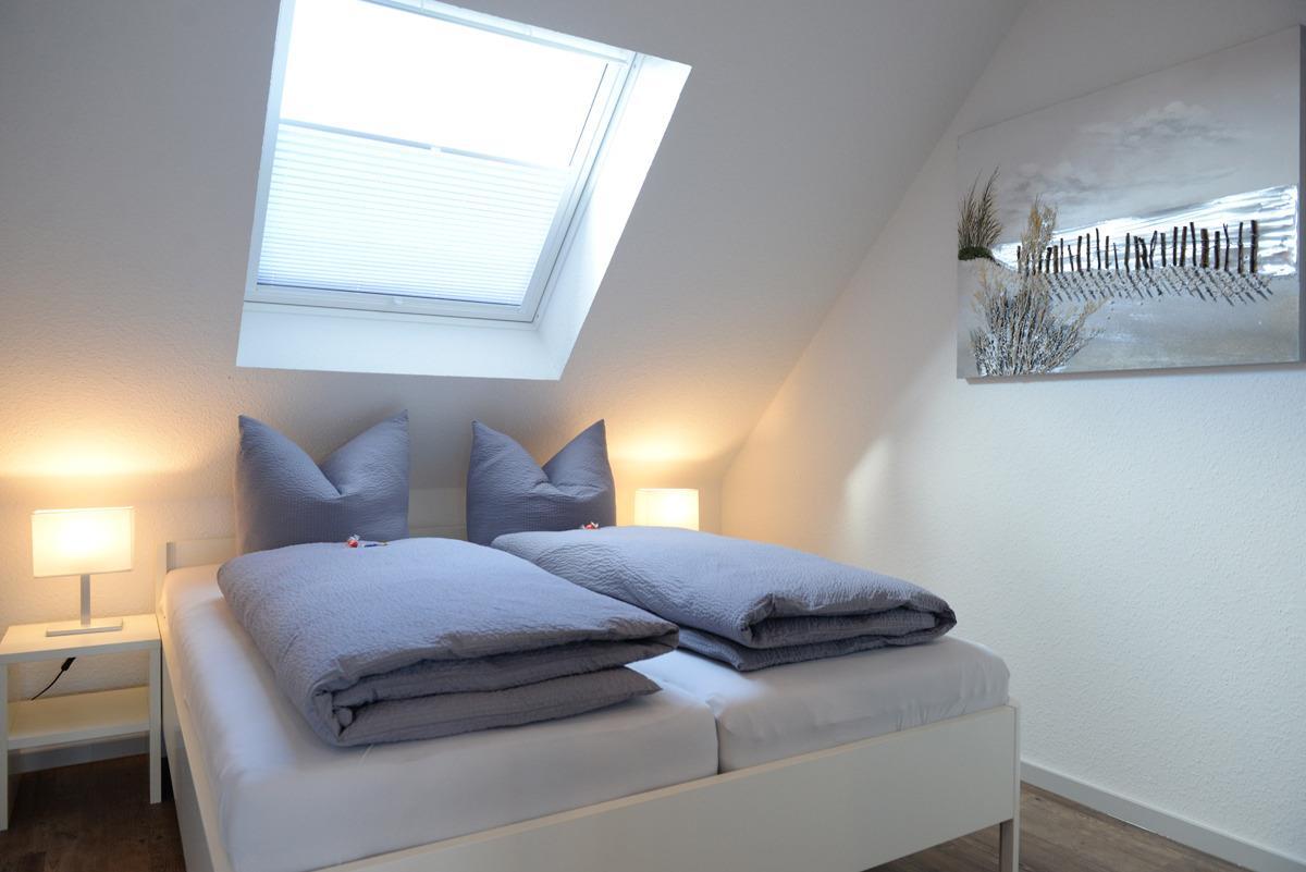 Die Wohnung verfügt über zwei getrennte Schlafzimmer, davon ist ein Schlafzimmer mit Doppelbett, SAT/TV, Veluxfenster mit elektrischer Verdunklung und das weitere Schlafzimmer mit einem Einzelbett und einem Fenster mit elektrischer Außenjalousie ausgestattet.