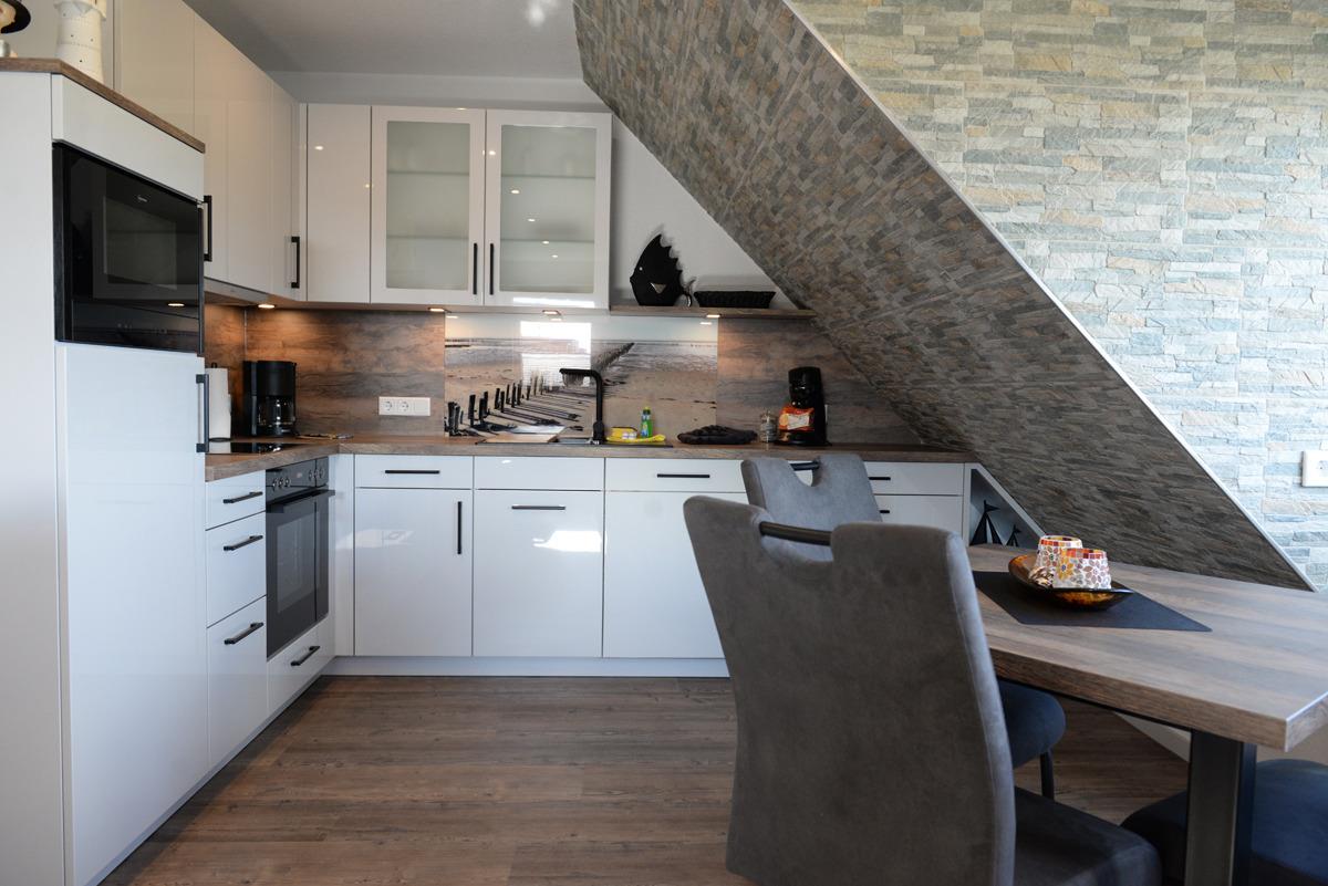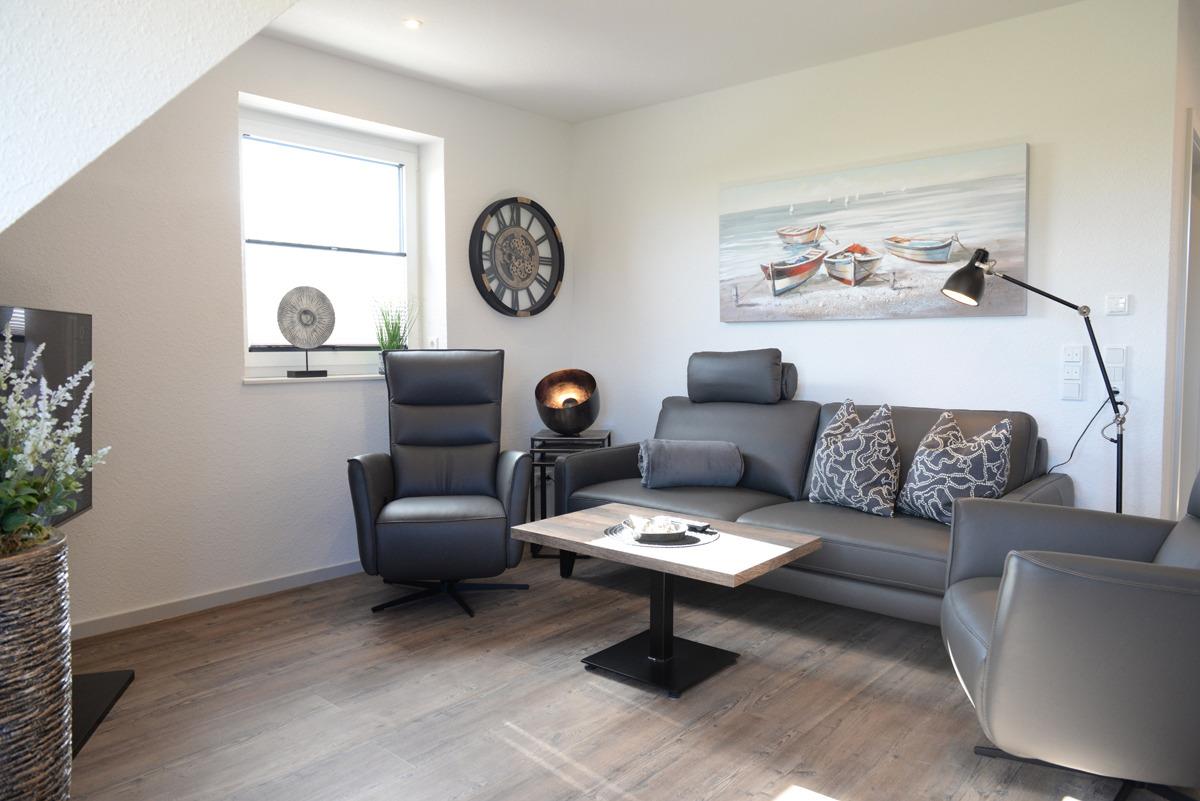 Das Wohn/Esszimmer ist mit einer gemütlichen Couch u. 2 Relaxsessel, einem Flachbildschirm-Fernseher, einer Essgruppe und einer voll ausgestatteten Einbauküche eingerichtet. Von dort aus gelangen Sie auf einen Balkon, der mit Gartenmöbeln und Sonnenschirm ausgestattet ist. Dieses Plätzchen lädt sie zum Sonnenbaden oder für den späteren Sonnenuntergang am Abend ein.