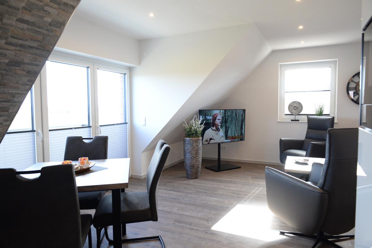 Die Ferienwohnung Deichdeck 2 OR für 3 Personen befindet sich im 1. OG eines neu erbauten Ferienhauses mit insgesamt 4 Ferienwohnungen in Norddeich. Die Wohnung liegt in einer zentralen und sackgassenähnlichen Lage.