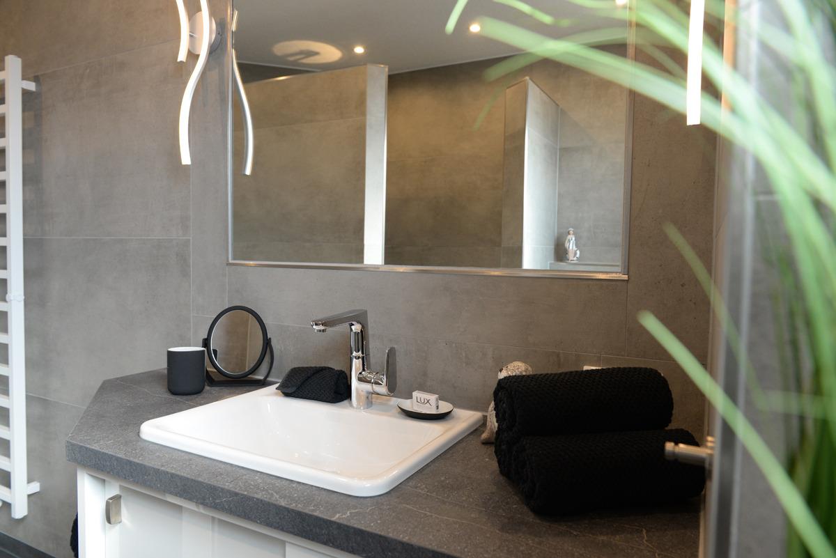 Das moderne Badezimmer mit Fenster verfügt über eine bodenebene Dusche, einem WC, eine Waschtischkombination mit großem Spiegel, Föhn usw.