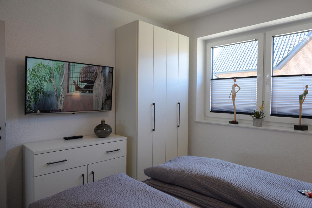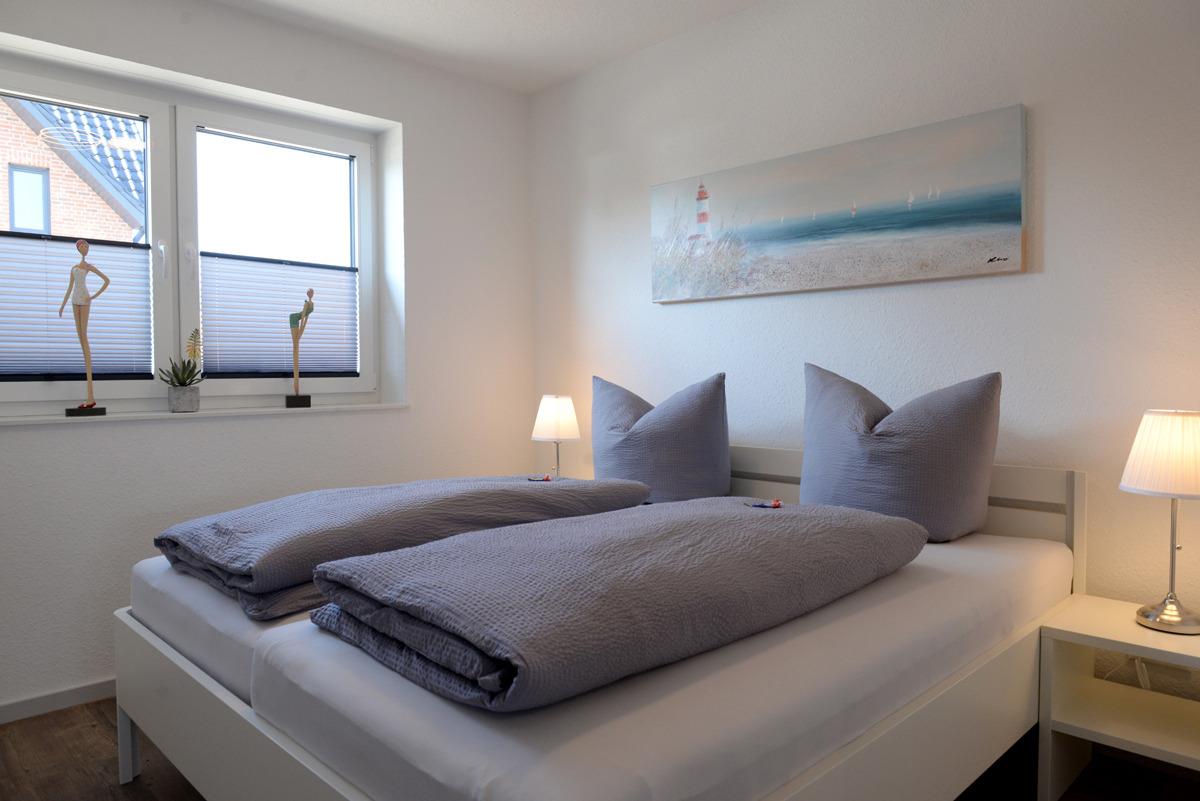 Das Schlafzimmer ist mit einem Doppelbett, Sat/TV, elektrische Außenrollläden + Verdunklungsplissees ausgestattet.