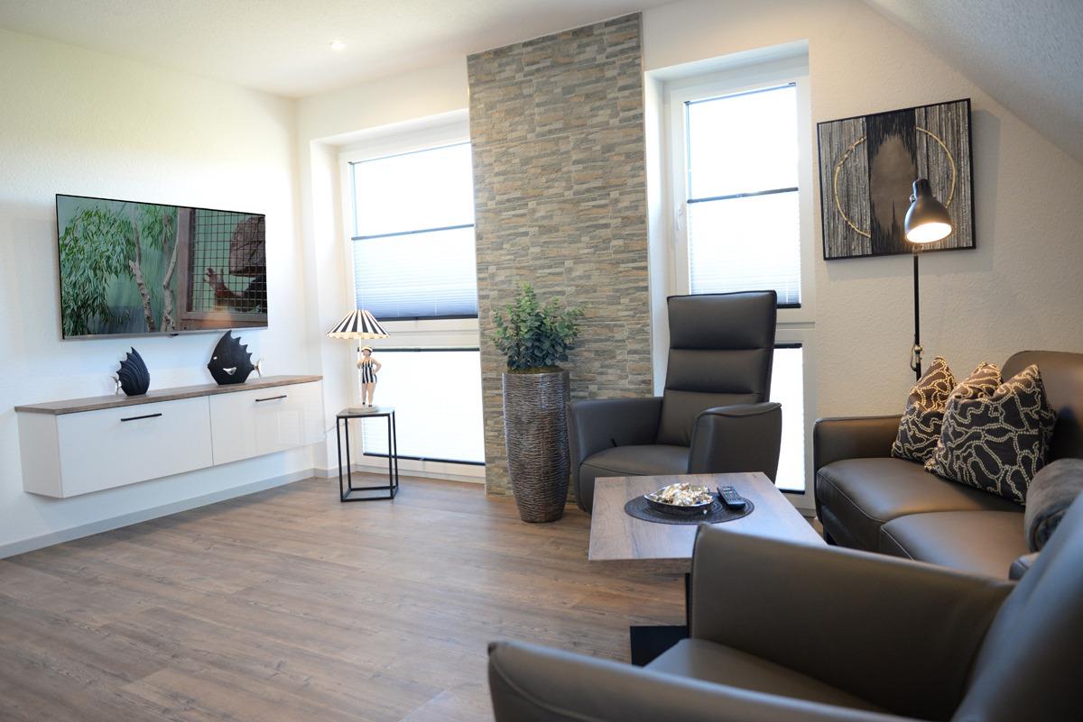 Die Ferienwohnung Deichdeck 3 OL für 2 Personen befindet sich im 1. OG eines neu erbauten Ferienhauses mit insgesamt 4 Ferienwohnungen in Norddeich. Die Wohnung liegt in einer zentralen und sackgassenähnlichen Lage. Das Wohn/Esszimmer ist mit einer gemütlichen Couch u. 2 Sessel, einem Flachbildschirm-Fernseher, einer Essgruppe und einer voll ausgestatteten Einbauküche eingerichtet. Von dort aus gelangen Sie auf einen Balkon, der mit Gartenmöbeln und einem Sonnenschirm ausgestattet ist. Dieses Plätzchen lädt Sie zum Sonnenbaden oder für den späteren Sonnenuntergang am Abend ein.