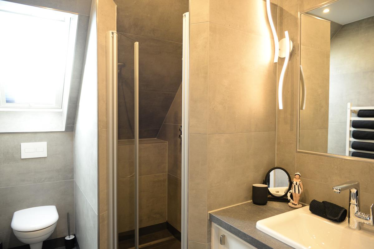 Das moderne Badezimmer mit Veluxfenster verfügt über eine bodenebene Dusche, einem WC, eine Waschtischkombination mit großem Spiegel, Föhn usw.
