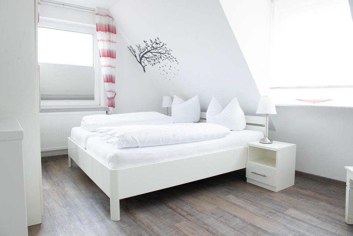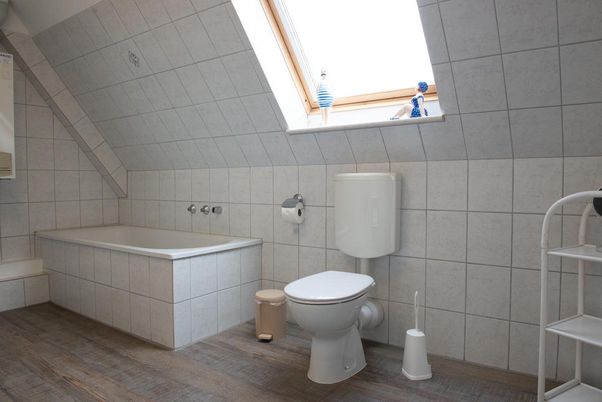 Auf der 2. Etage befinden sich die beiden Schlafzimmer mit je einem Doppelbett, in einem Schlafzimmer befindet sich ein Fernseher an der Wand.. Ebenfalls oben ist das große Badezimmer mit WC und Fenster.