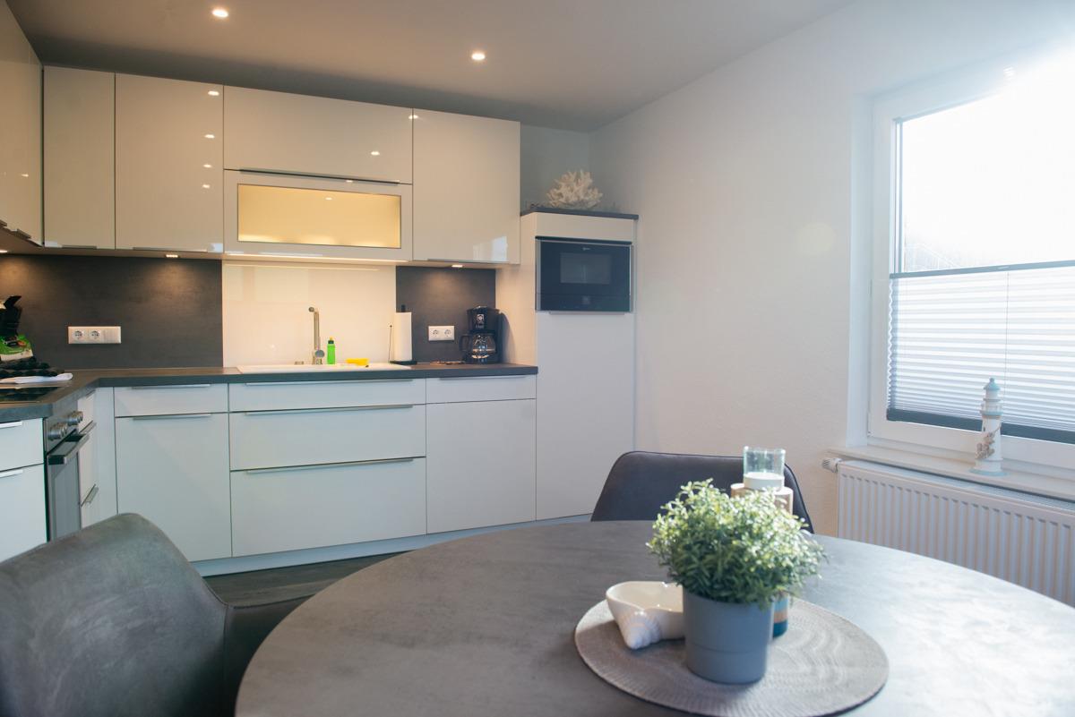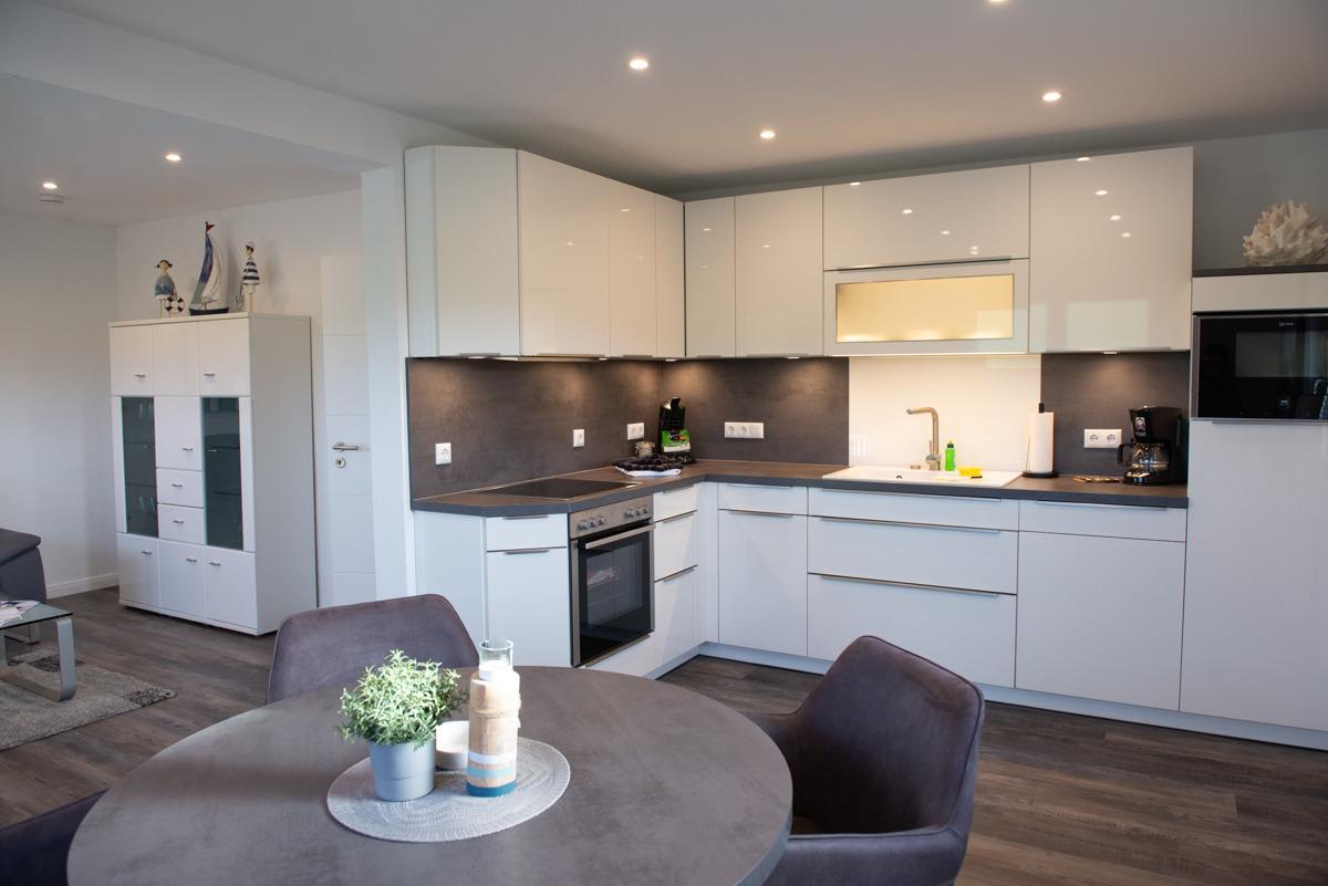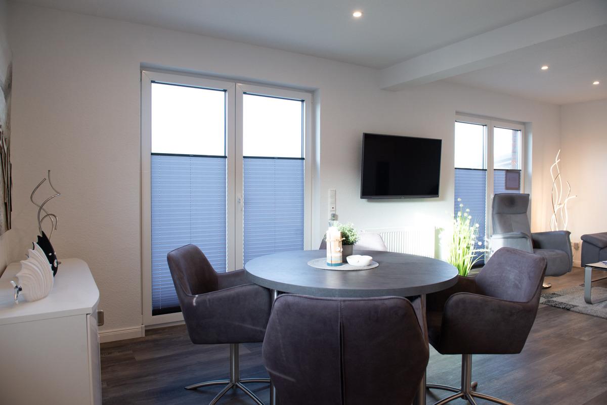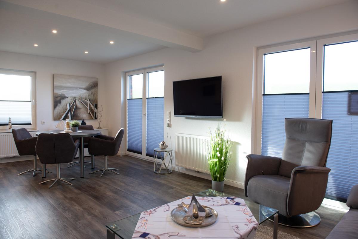 Die Ferienwohnung "Deichhöhe VU" für 2 Personen befindet sich im Erdgeschoß eines neu erbauten Ferienhauses mit insges. 4 Wohnungen. Die Wohnung liegt in einer TOP Lage, mit einem direkten Blick zum Deich. Das Wohn/Esszimmer ist mit einer gemütlichen Couch, einem Relaxsessel, einer Essgruppe und einer Einbauküche cpl. eingerichtet - von dort aus gelangen Sie auf die möblierte Terrasse. Das Schlafzimmer ist mit einem Doppelbett, Fernseher und Verdunklungsplissees ausgestattet. Das moderne Bad mit Fenster verfügt über eine bodenebene Dusche, WC, Waschtischkombination mit großem Spiegel, Föhn und Hocker. Es ist alles ebenerdig eingerichtet - allerdings für Rollstuhlfahrer leider nicht geeignet. Ein PKW Einstellplatz ist direkt am Haus - ebenso eine Fahrradgarage mit Stromanschluß.