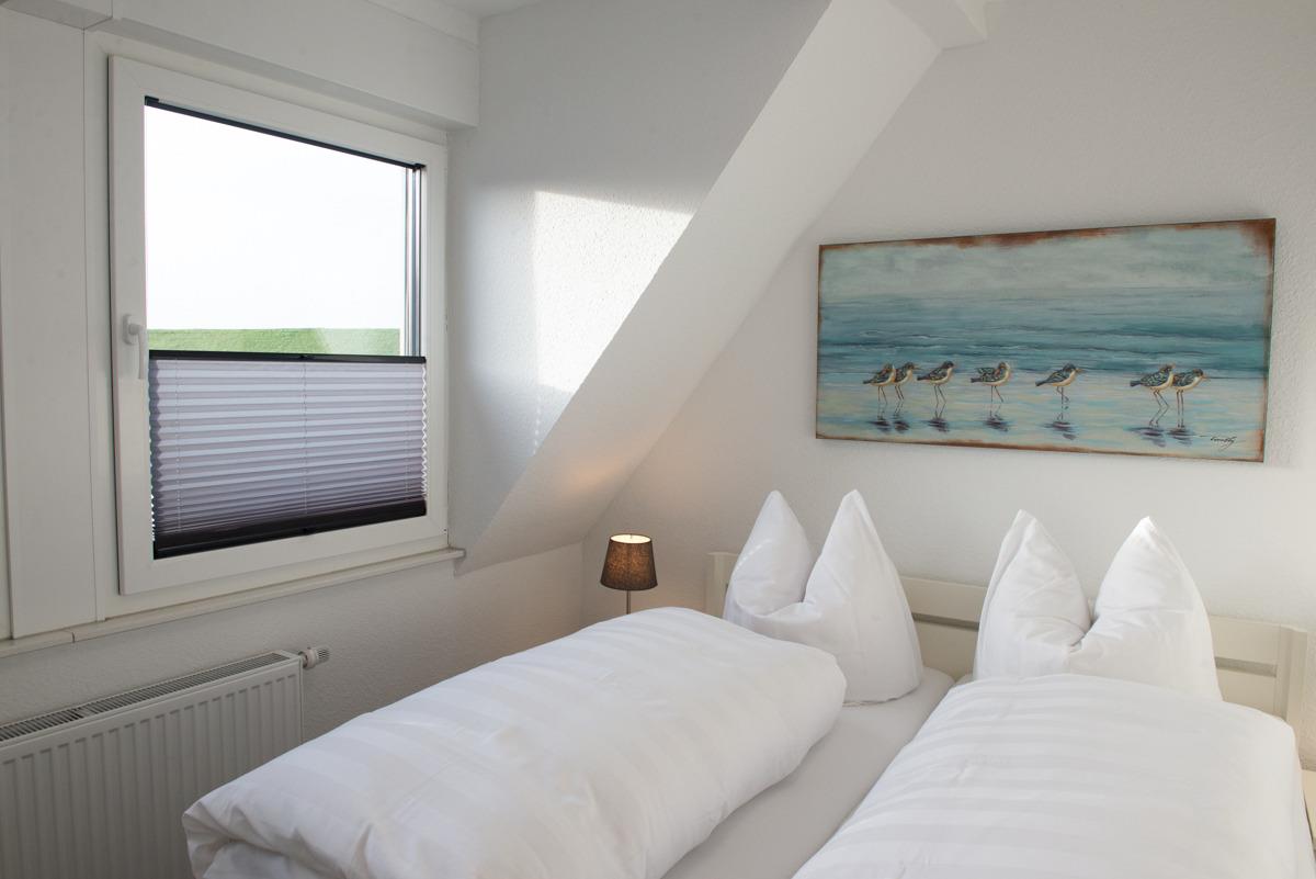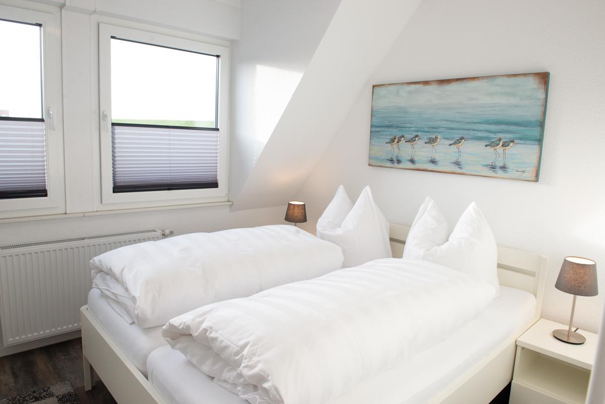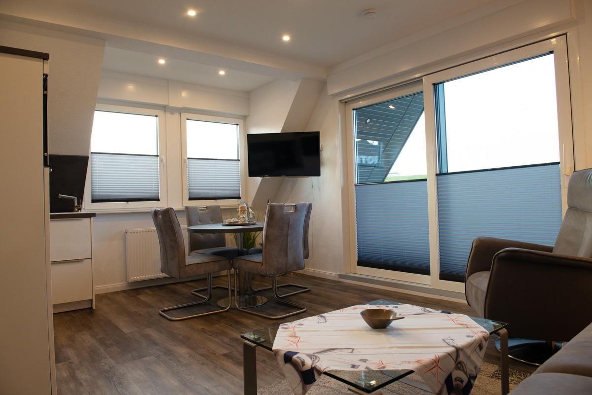 Die Ferienwohnung "Deichhöhe VO" für 2 Personen befindet sich im 1. OG eines neu erbauten Ferienhauses mit insges. 4 Wohnungen. Die Wohnung liegt in einer TOP Lage mit einem direkten Blick zum Deich. Das Wohn-Esszimmer ist mit einer gemütlichen Couch, 2 Sessel, einer Essgruppe, einem Fernseher und einer integrierten Einbauküche ausgestattet-von dort aus gelangen Sie auf die möblierte überdachte Dachloggia. Das Schlafzimmer ist mit einem Doppelbett, Fernseher, Aussenrolläden und Verdunklungsplissees ausgestattet. Das moderne Bad mit Fenster verfügt über eine bodenebene Dusche, einem WC, einer Waschtischkombination mit großem Spiegel, einem Föhn und einem Hocker.