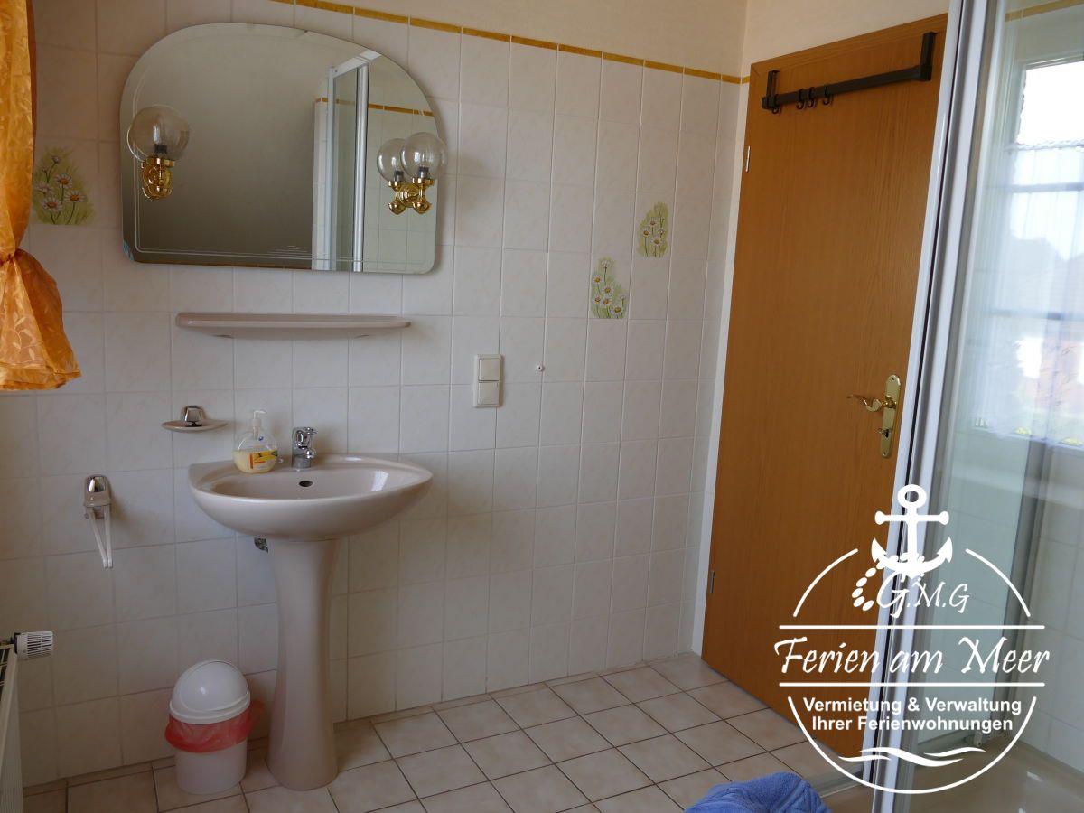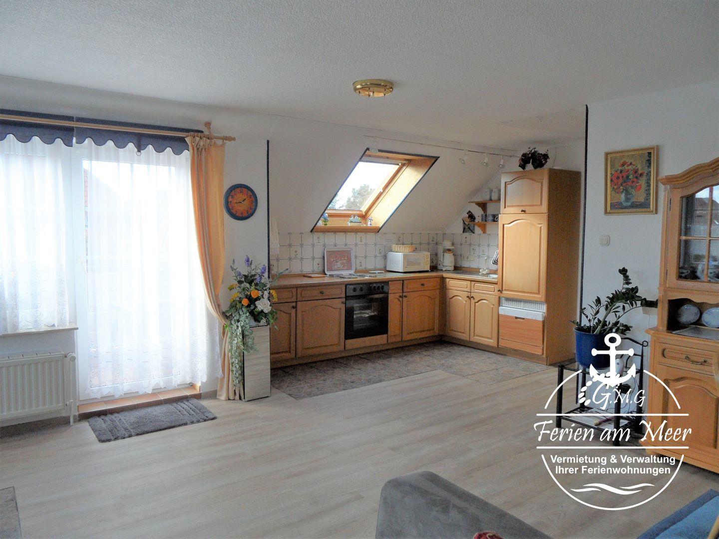Diese Oberwohnung verfügt über eine voll eingerichtete Küche mit Mikrowelle, E-Herd mit Backofen, Kühlschrank mit Gefrierfach, Geschirrspüler, Waschmaschine, und Duschbad sowie Fernseher und Radio mit Satellitenempfang.