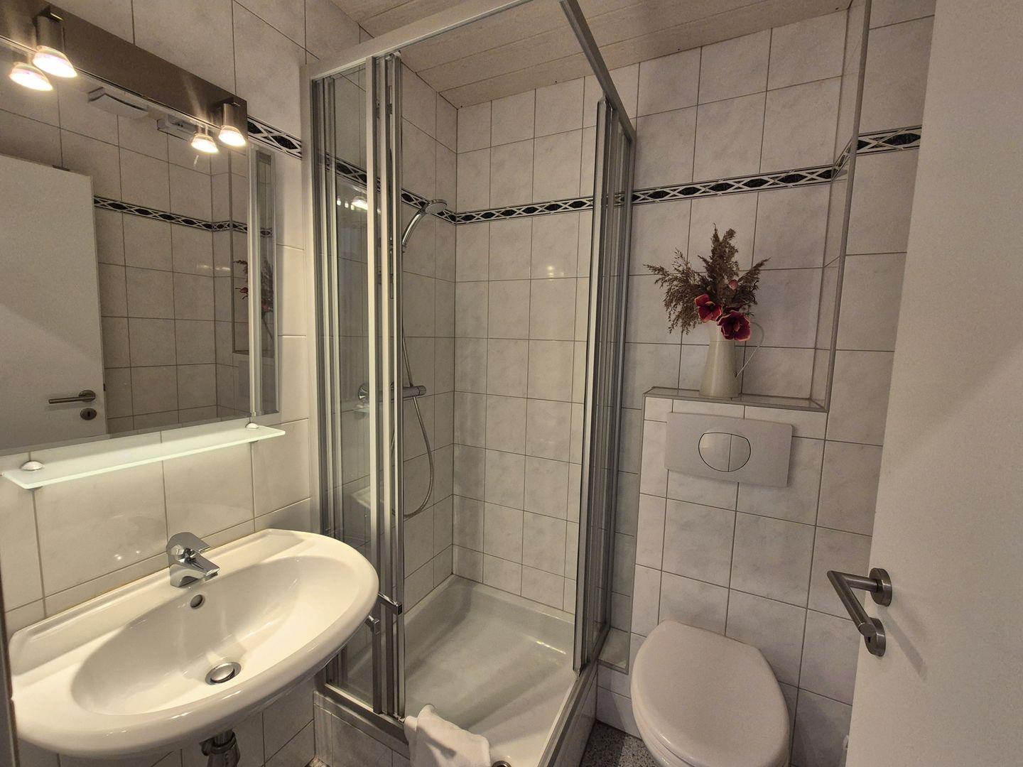 Ein Schlafzimmer mit Doppelbett sowie ein Duschbad rundet das Angebot ab.