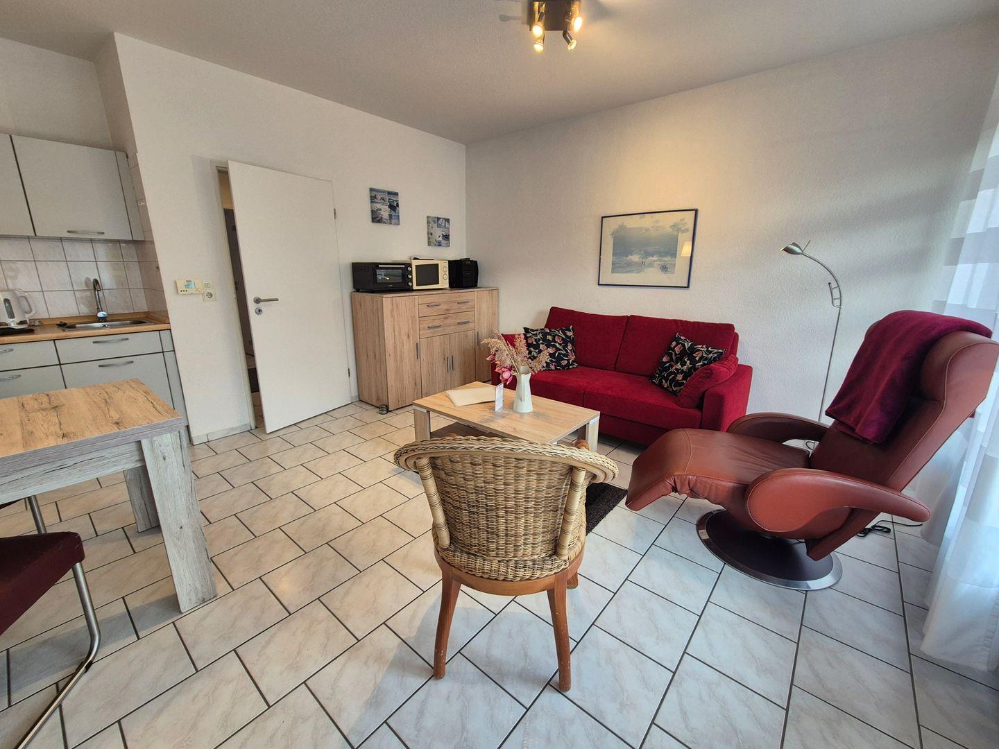 Verbringen Sie einen erholsamen Urlaub zu zweit in dieser gemütlichen Ferienwohnung mit Terrasse. Der kombinierte Wohn- und Essbereich bietet Ihnen eine gemütliche Sofaecke, einen Essplatz sowie eine kleine Küchenzeile. Diese verfügt unter anderen über eine Mikrowelle und einem 2-Platten-Herd.