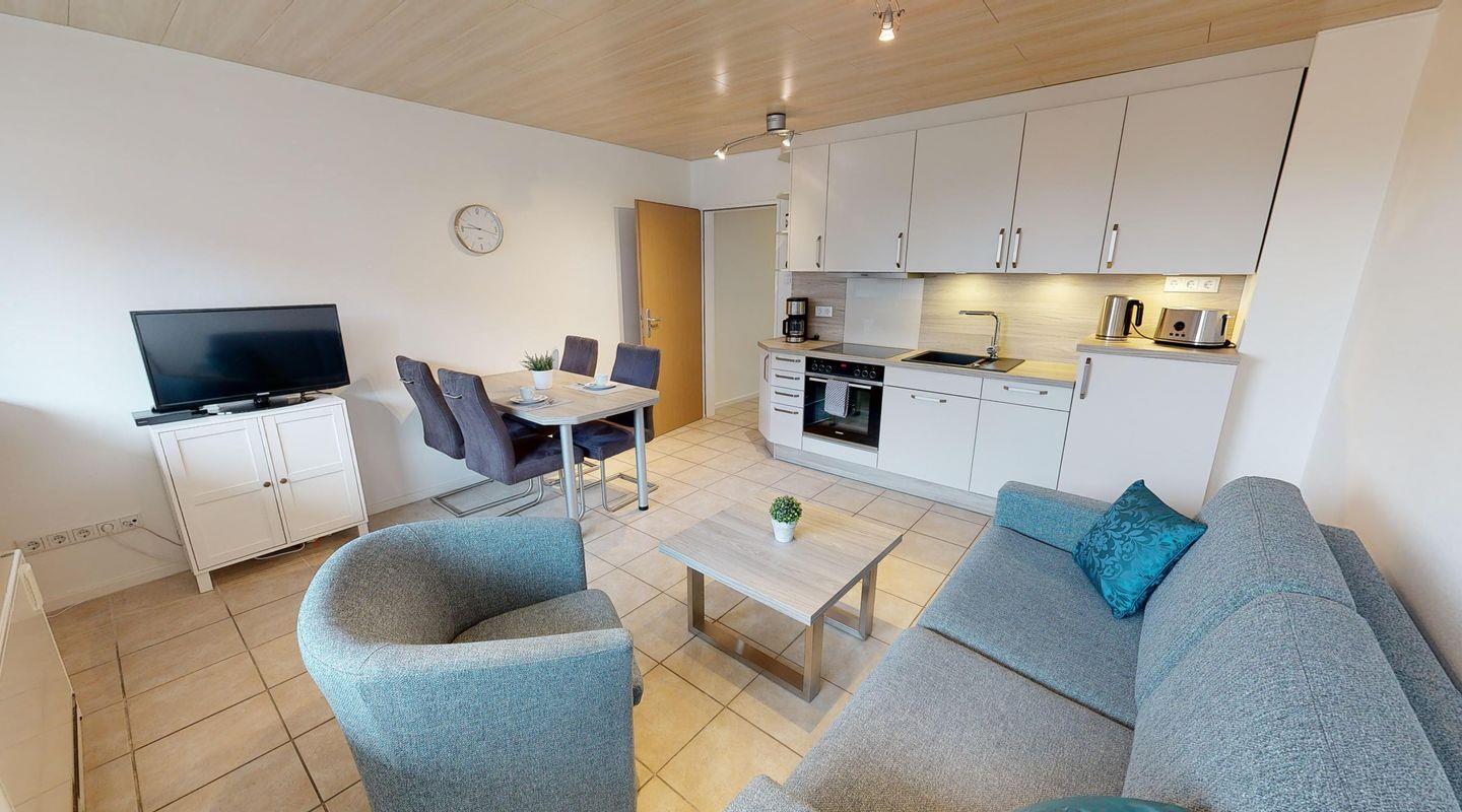 Dieses schöne Apartment befindet sich in direkter Nähe zum Strand mit Deichblick. Freuen Sie sich auf einen erholsamen Urlaub und entspannen Sie auf dem eigenen Balkon. Ihnen steht ein kombinierter Wohn-Küchenbereich zur Verfügung. Aufgeteilt in einen gemütlichen Wohnbereich mit TV, eine Küchenzeile mit, Spülmaschine, Ceranfeld und Backofen und Essbereich. Ebenfalls steht Ihnen ein Duschbad bereit. Das Schlafzimmer ist mit einem Doppelbett (180*200cm) ausgestattet. Das Apartment wurde 2021/22 frisch renoviert!