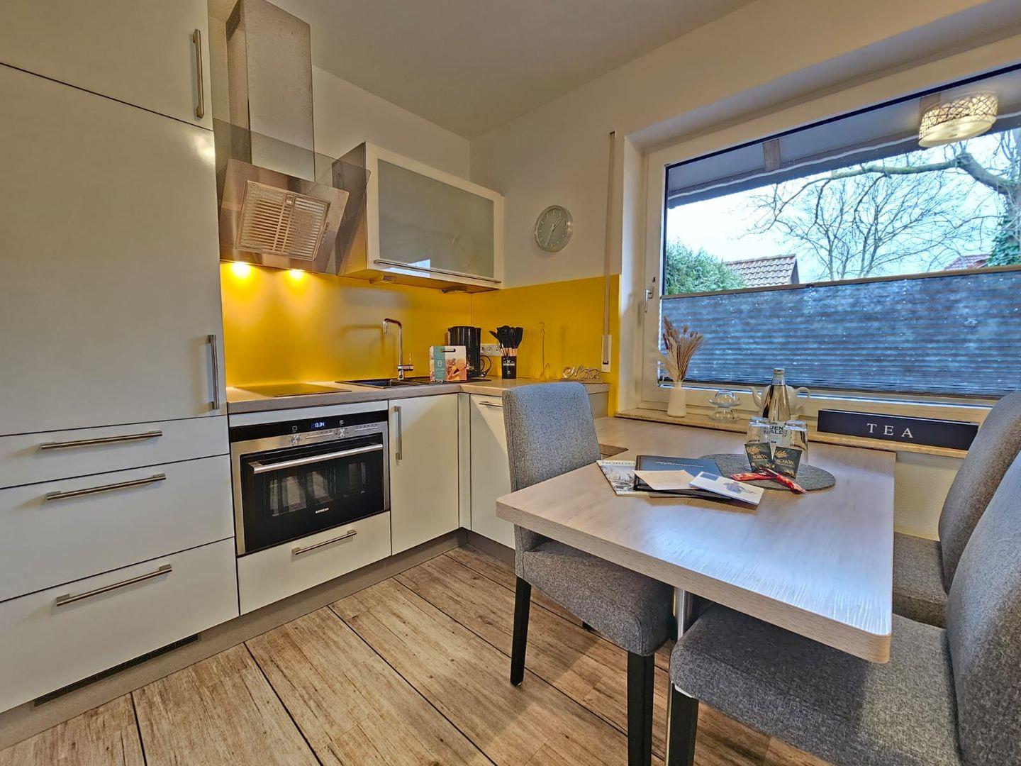 Die Ferienwohnung verfügt über eine offene Wohnküche mit moderner, vollständig ausgestatteter Küche, einem Esstisch für zwei Personen und einer gemütlichen Sofaecke zum Entspannen. Hier können Sie nach einem erlebnisreichen Tag an der Nordsee gemeinsam essen, Spiele spielen oder einfach die Ruhe genießen. Alle Fenster sind mit Plissees und Rollläden ausgestattet, sodass Sie sich jederzeit ungestört zurückziehen können.