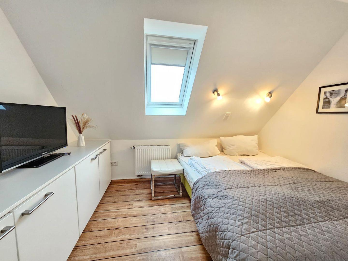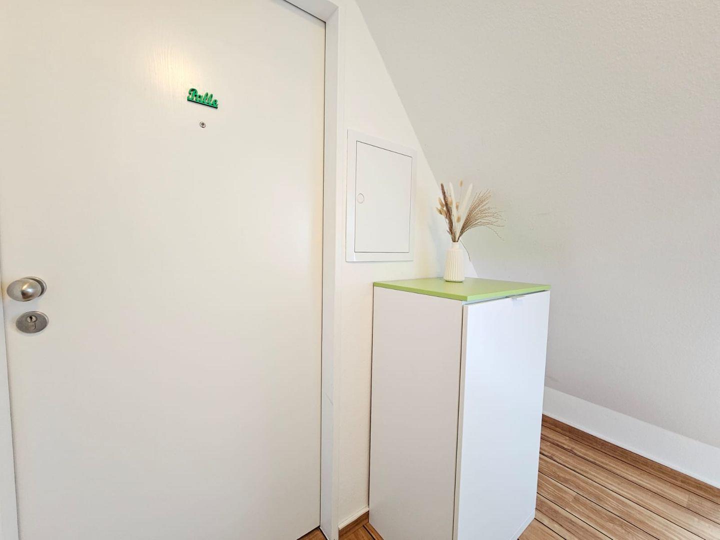 Eine kleine feine Unterkunft ist die Wohnung Palle. In frischem Grün mit großem Boxspringbett und Schlafsofa bietet sie trotzdem richtig viel Raum zum Wohnen.