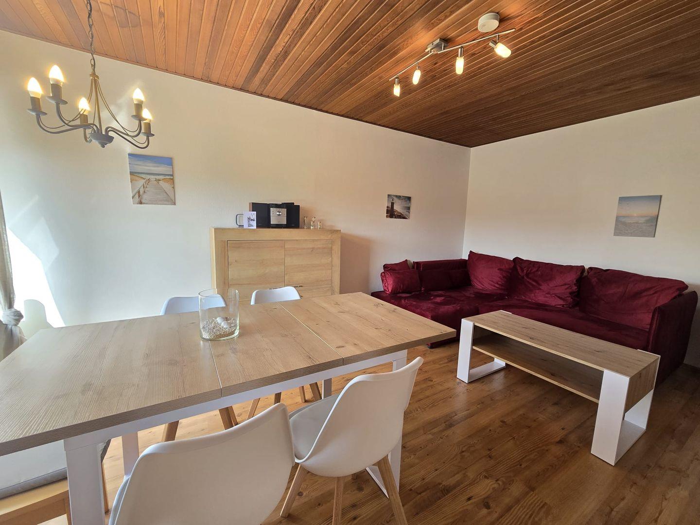 Gemütlicher Wohnbereich mit Sat-TV und DVD-Player, ideal für entspannte Abende nach einem Tag an der Nordsee