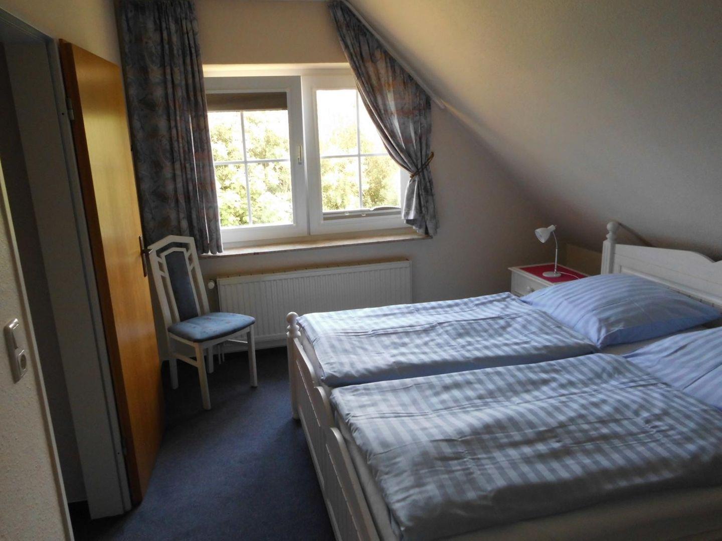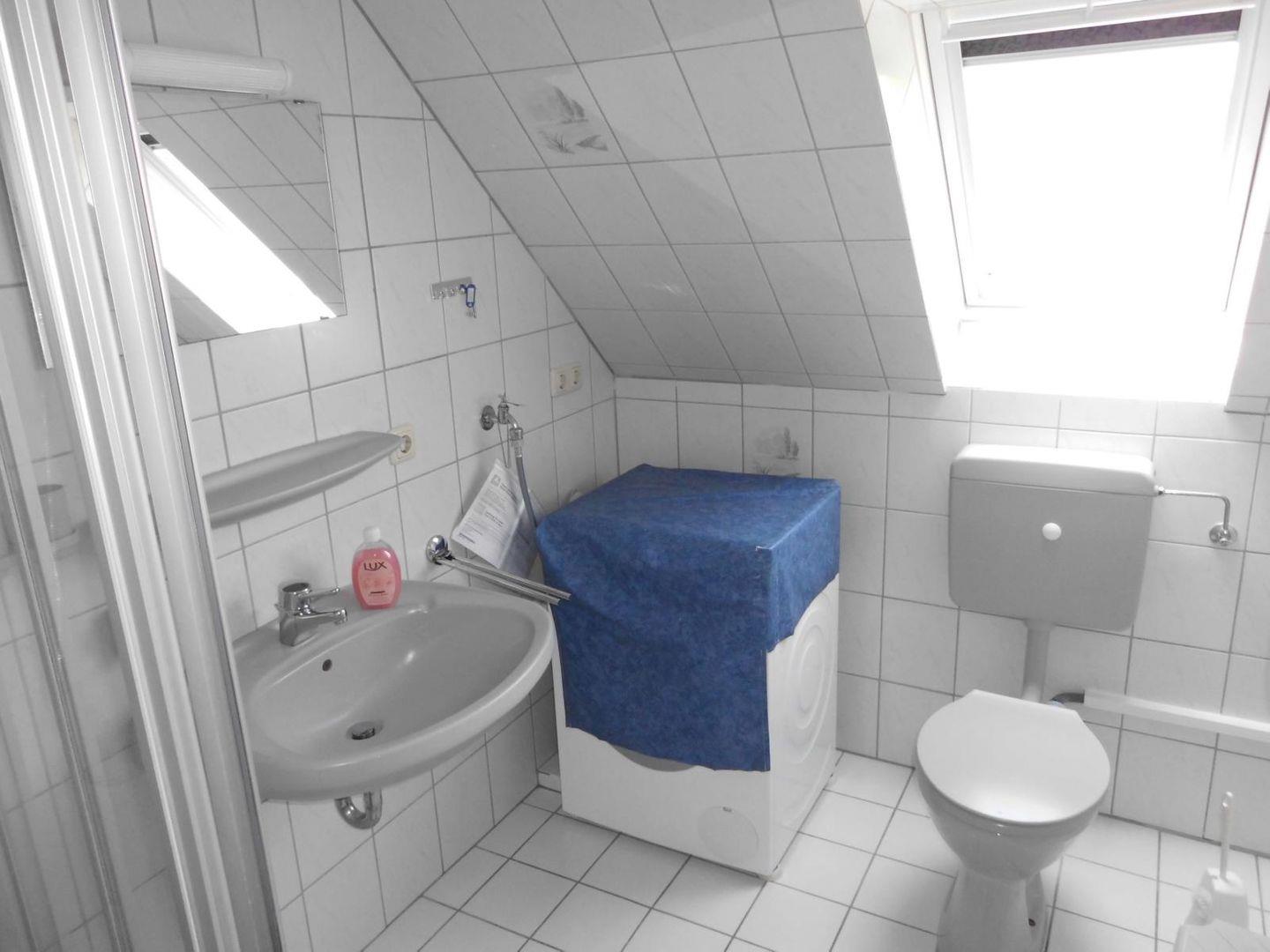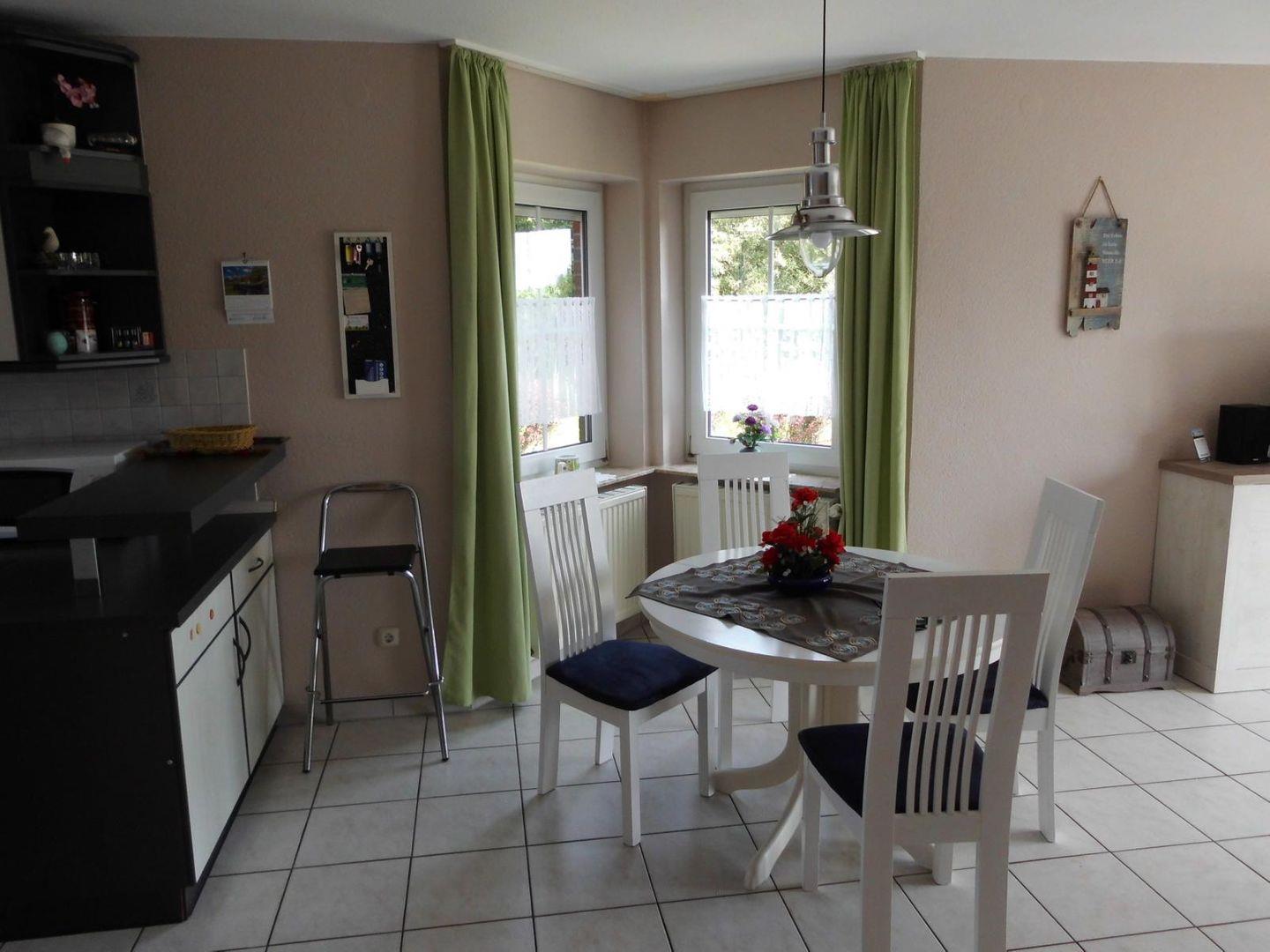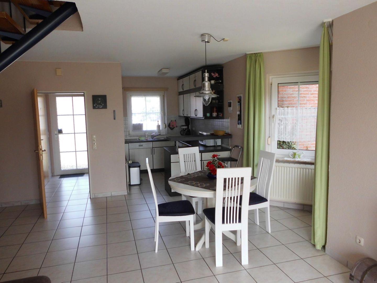 Im Erdgeschoss befindet sich der geräumige komplett geflieste Wohn- Essbereich mit gut ausgestatteter Einbauküche mit Mikrowelle, Kühlschrank, Backofen, Geschirrspülmaschine, Kaffeemaschine u.v.m.. Ein Gäste-WC befindet sich ebenfalls im EG. Im Wohnbereich befindet sich ein großer Flachbild-Fernseher, DVD-Player und eine Musikanlage. Im Obergeschoss gibt es 2 Schlafräume (1 x 1 Doppelbett, 1 x 2 Einzelbetten) und ein Duschbad mit WC und Waschmaschine.
