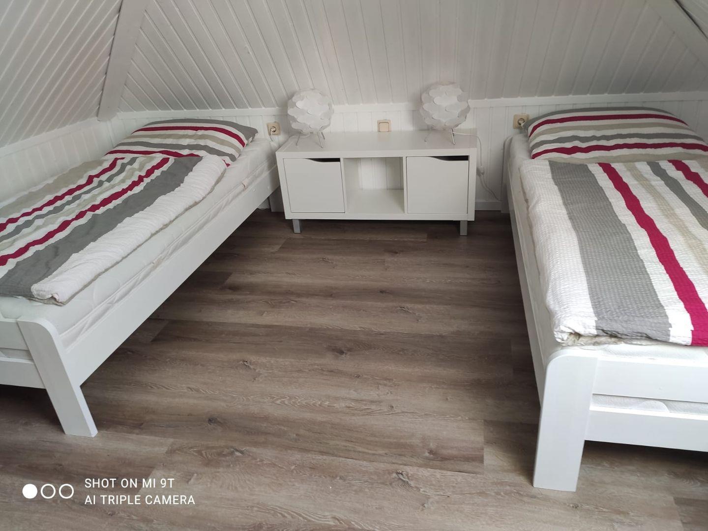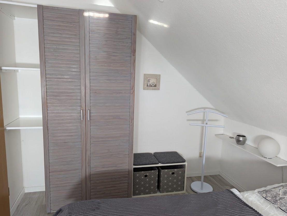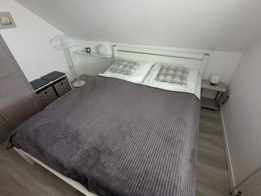 Auf der gleichen Etage befindet sich ein Schlafzimmer mit einem Doppelbett und einem Kleiderschrank. Das zweite Schlafzimmer befindet sich im Dachgeschoss mit zwei Einzelbetten und ist über eine Raumspartreppe zu erreichen. Ebenfalls gibt es ein geräumiges Duschbad und einen möblierten Balkon. Die Wohnung verfügt bis auf das Bad über Außenrollos. Ein PKW-Abstellplatz ist vor der Wohnung vorhanden.