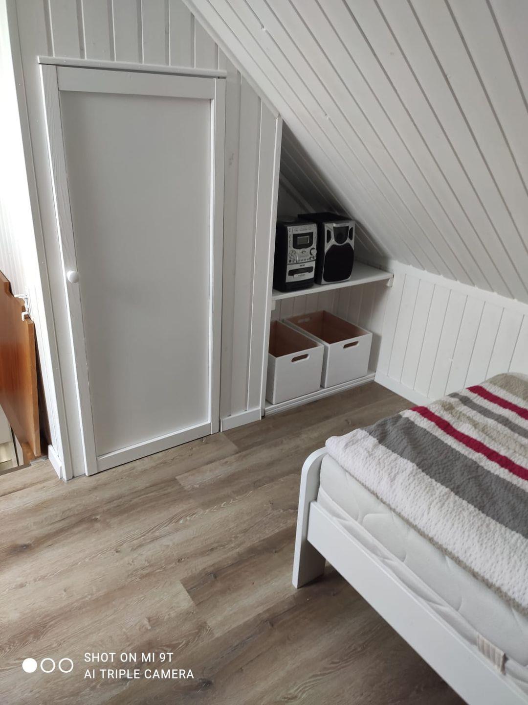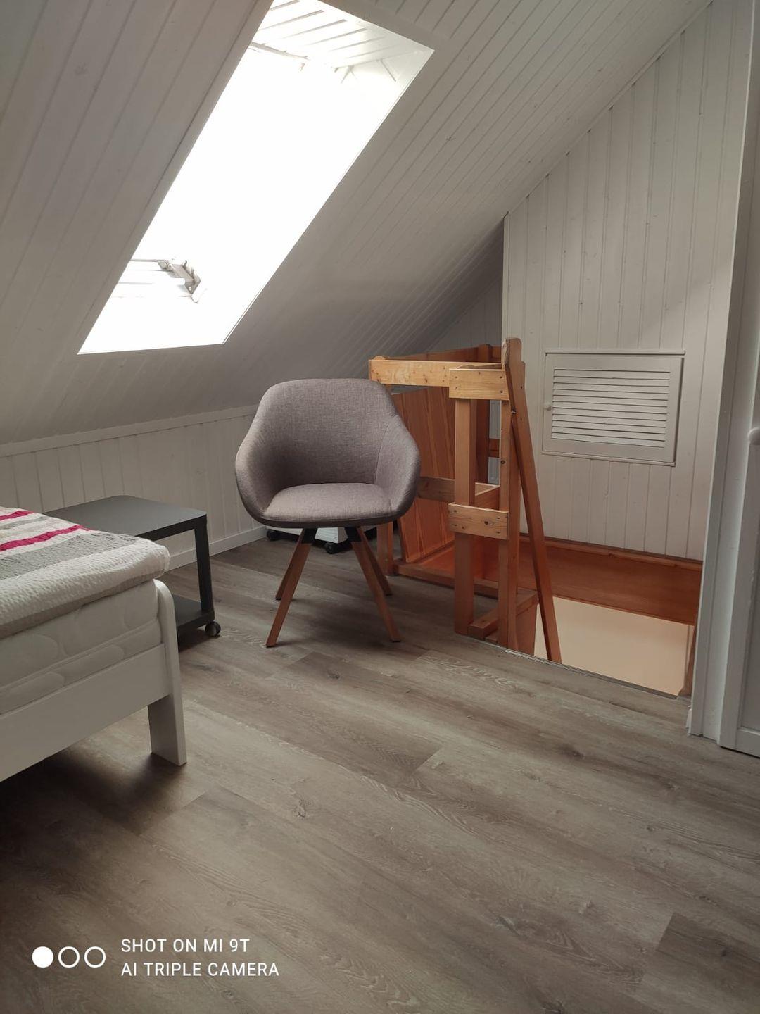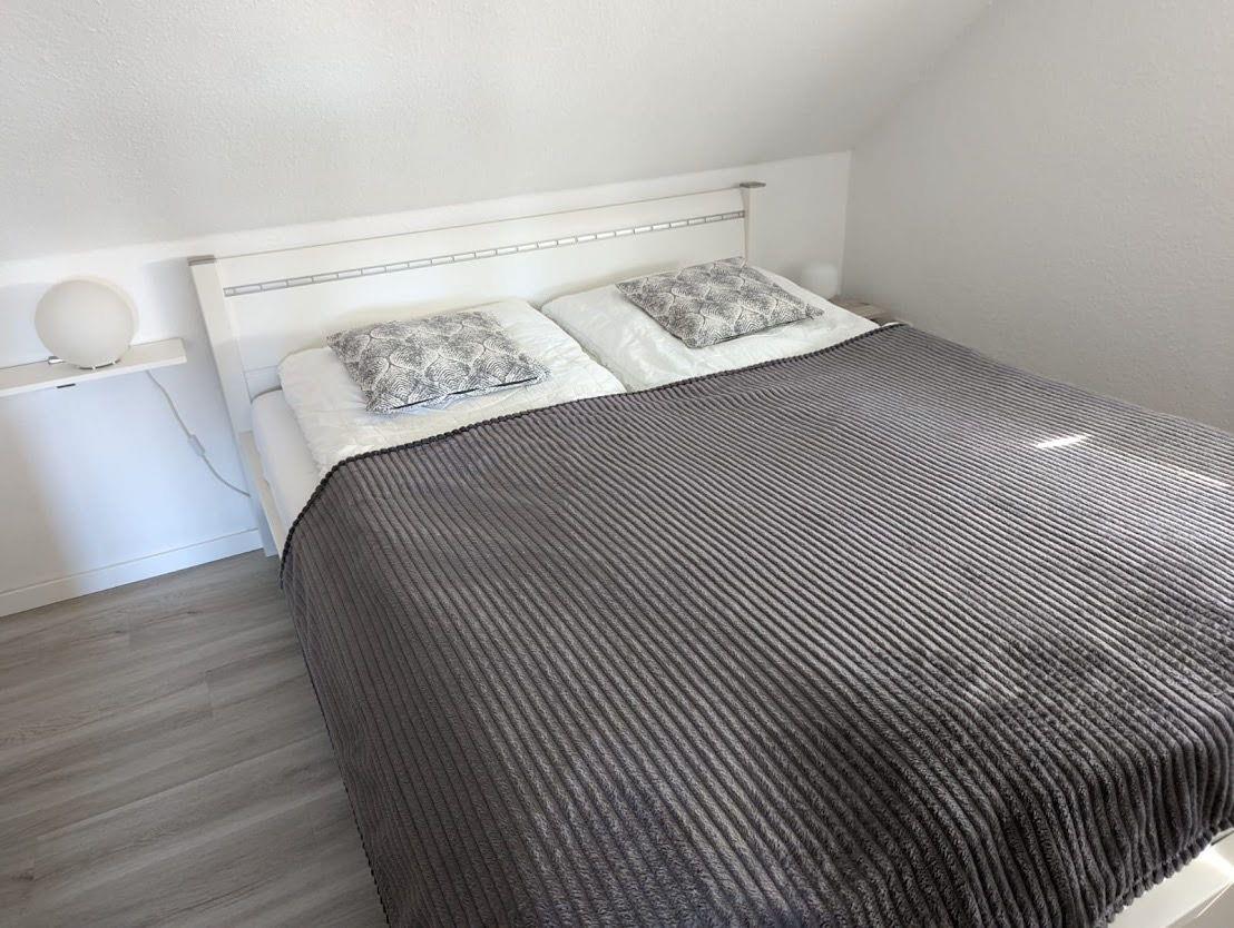 Auf der gleichen Etage befindet sich ein Schlafzimmer mit einem Doppelbett und einem Kleiderschrank. Das zweite Schlafzimmer befindet sich im Dachgeschoss mit zwei Einzelbetten und ist über eine Raumspartreppe zu erreichen. Ebenfalls gibt es ein geräumiges Duschbad und einen möblierten Balkon. Die Wohnung verfügt bis auf das Bad über Außenrollos. Ein PKW-Abstellplatz ist vor der Wohnung vorhanden.