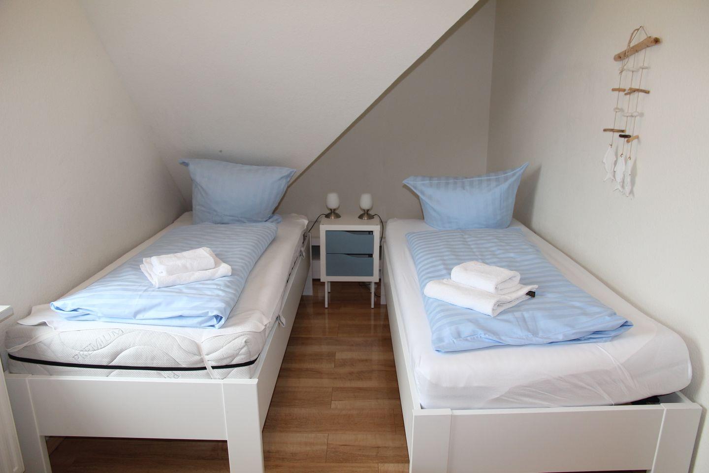 Die Wohnung ist sehr modern und hochwertig ausgestattet. Sie verfügt über 3 Schlafzimmer (davon eines mit einem Doppelbett auf der 2. Etage und 2 Schlafzimmer mit je 2 Einzelbetten auf der 3. Etage). Dazu gehört auf jeder Etage ein Badezimmer mit Dusche. Die Schlafräume verfügen über einen Laminatboden, alle übrigen Wohnräume sind gefliest und haben eine Fußbodenerwärmung.