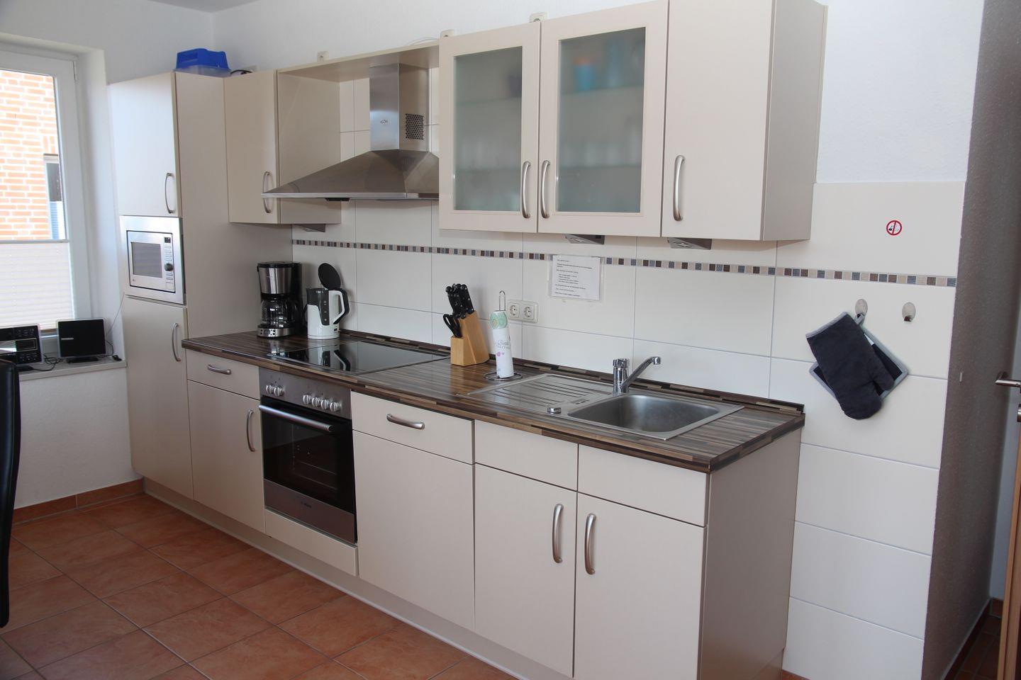 Großer Wohn-Essbereich mit voll ausgestatteter Küche mit Cerankochfeld, Kühl-Gefrierkombination, Geschirrspüler, Mikrowelle, Wasserkocher, Kaffeemaschine, Toaster etc.. Flachbildschirm, CD-Player und DVD-Player.