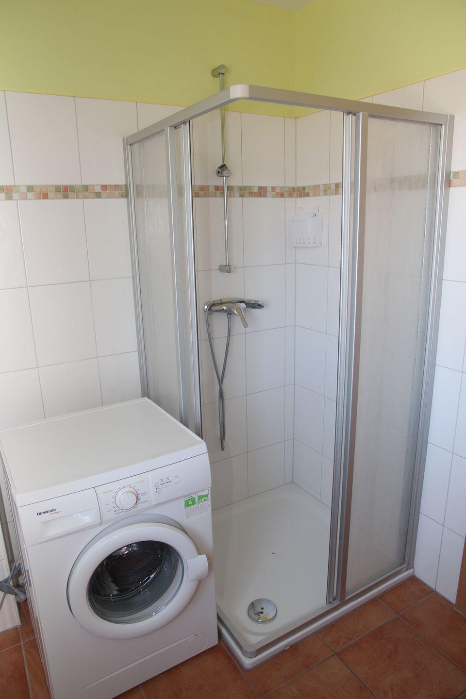 Bad mit Dusche (mit niedrigem Einstieg), WC, Waschmaschine, Fussbodenerwärmung und Handtuchwärmer. Bügelbrett/-eisen sind ebenfalls vorhanden.