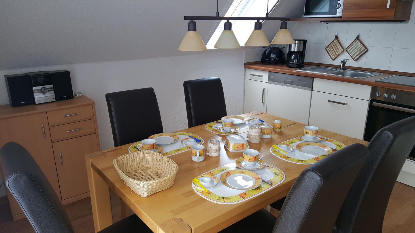 Großer Wohn- Essbereich mit voll ausgestatteter Küche mit Cerankochfeld, Kühl-Gefrierkombination, Geschirrspüler, Mikrowelle, Wasserkocher, Kaffeemaschine und Toaster.