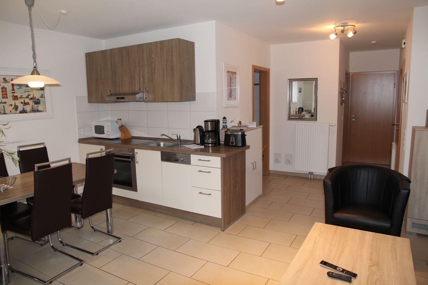 Der große Wohn-Essbereich ist komplett gefliest und verfügt über eine angenehme Fußbodenerwärmung. Die kleine Küche ist komplett ausgestattet mit allem was das Urlauberherz begehrt ... Geschirrspülmaschine, Backofen, Kühlschrank mit Gefrierfach, Kaffeemaschine, Mikrowelle, Wasserkocher u.v.m.