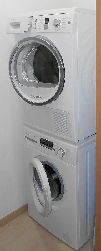 Im Abstellraum befinden sich eine Waschmaschine und ein Trockner, ein Wäscheständer, ein Bügeleisen und ein Bügelbrett.