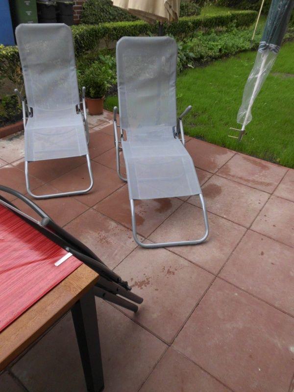 Die Terrasse ist mit Gartenmöbeln ausgestattet, dazu gehören vier Gartenstühle, ein großer Tisch, zwei Sonnenliegen und ein Sonnenschirm.
