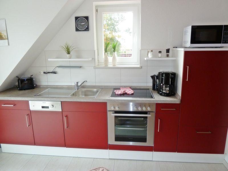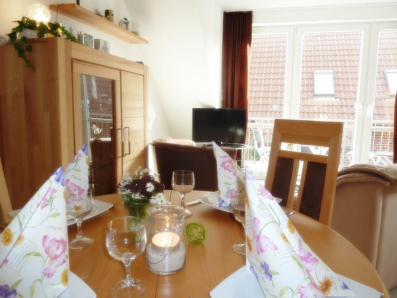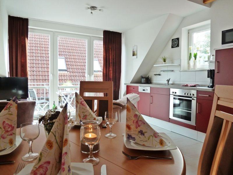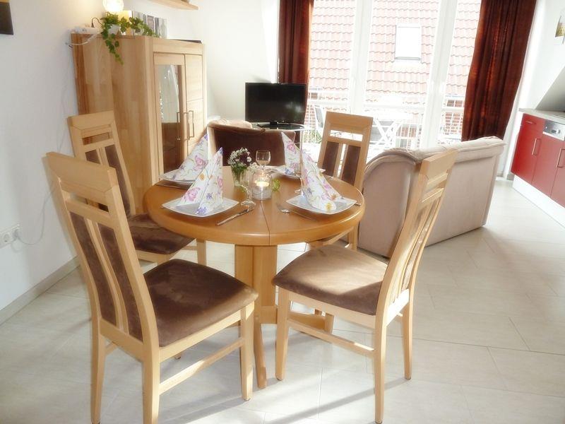 Der Wohn-Essbereich ist hell und freundlich eingerichtet. Die neue Küche ist komplett ausgestattet mit allem, was das Urlauberherz begehrt. Es gibt eine Geschirrspülmaschine, einen Backofen, eine Mikrowelle, einen Kühlschrank mit Gefrierfach, eine Kaffeemaschine und vieles mehr. Der Wohnraum ist gefliest und verfügt über eine angenehme Fußbodenerwärmung und Plissees an Fenster und Balkontür.