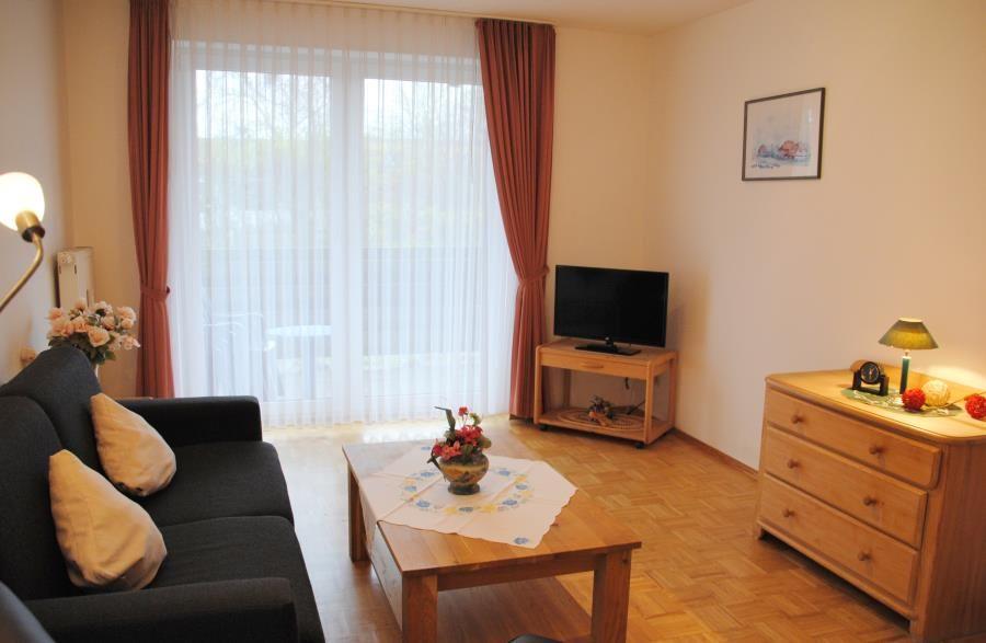 Das 2-Raum-Appartement im Erdgeschoss verfügt über ein separates Schlafzimmer mit Doppelbett, Wohn-Schlafraum (Schlafsofa) mit Kabel-TV, Terrasse, separate Küche und Dusche/WC.