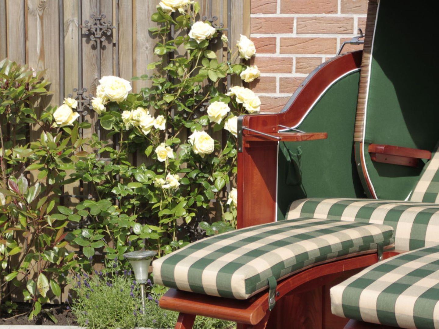 Die nicht einsehbare Terrasse mit dem kleinen Garten und einem gemütlichen Strandkorb ermöglicht es an lauen Sommerabenden bei einem gemeinsamen Grillen oder einem kühlen Glas Wein zu verweilen.